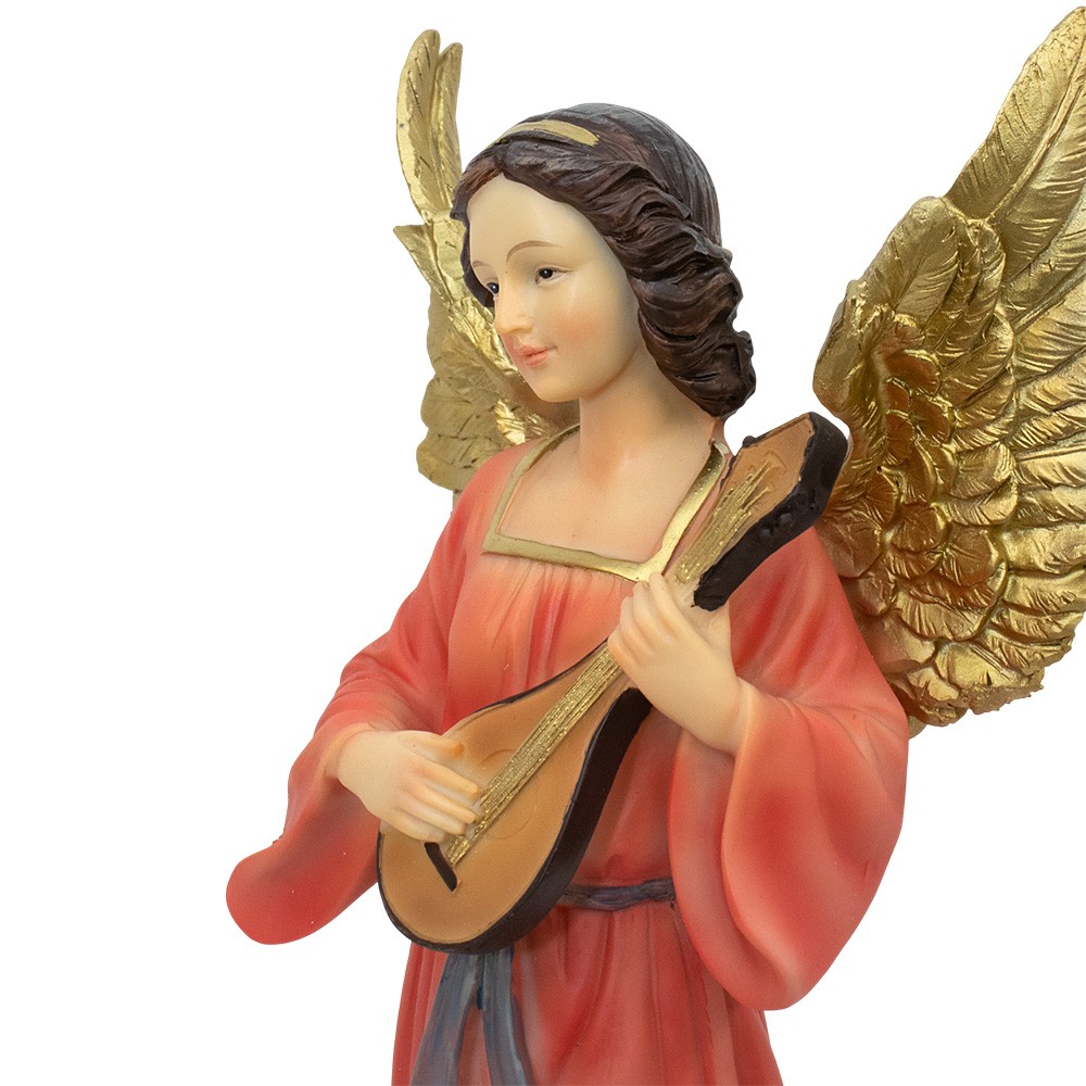 Resin statue depicting an angel with a mandolin, about 30 cm high. The statue is finely hand-painted.