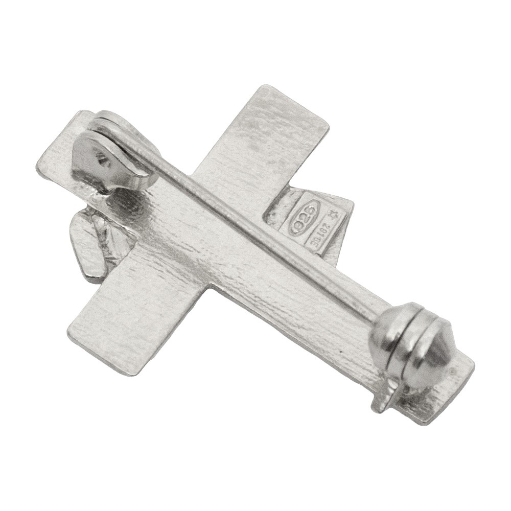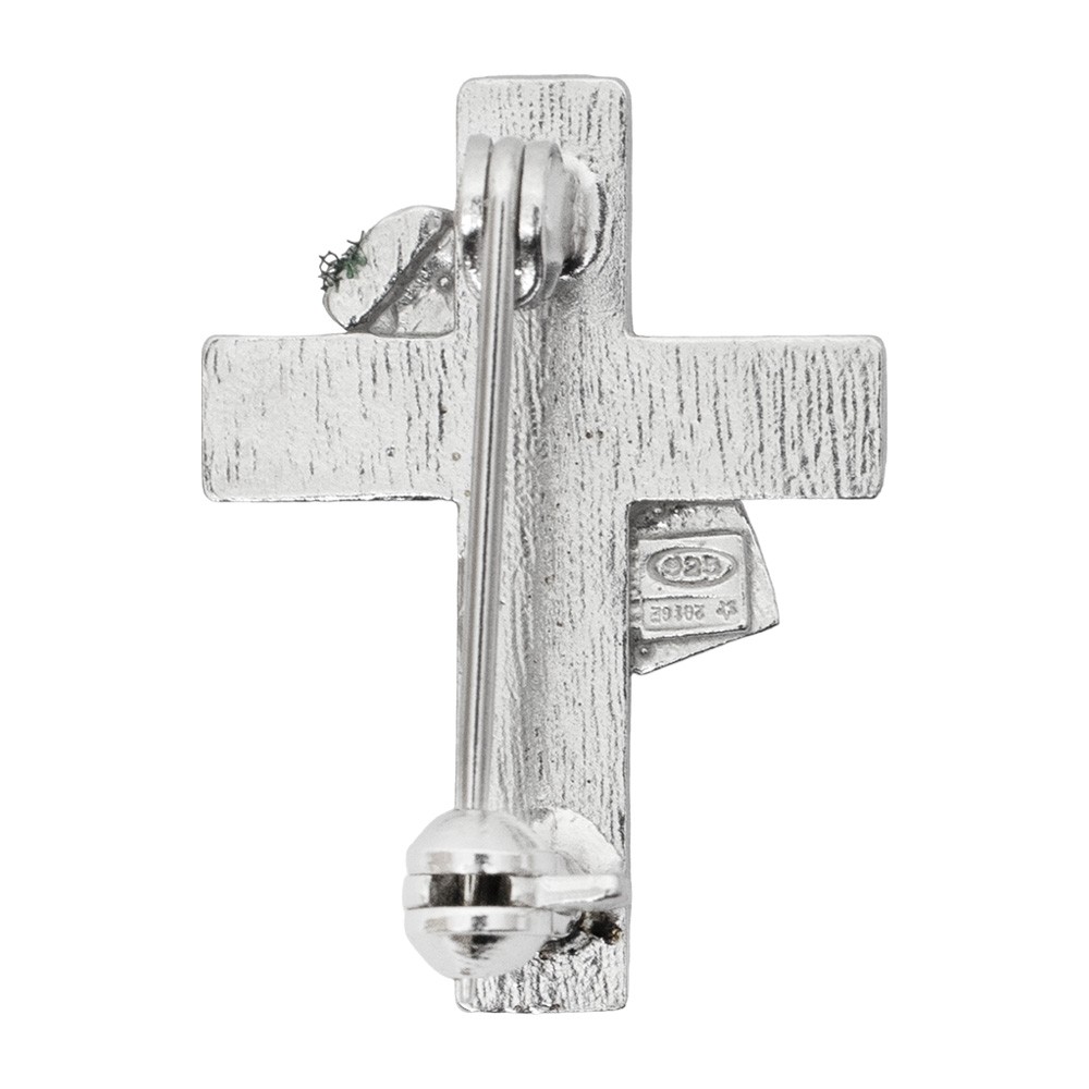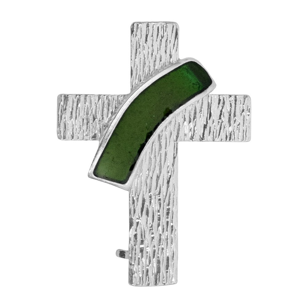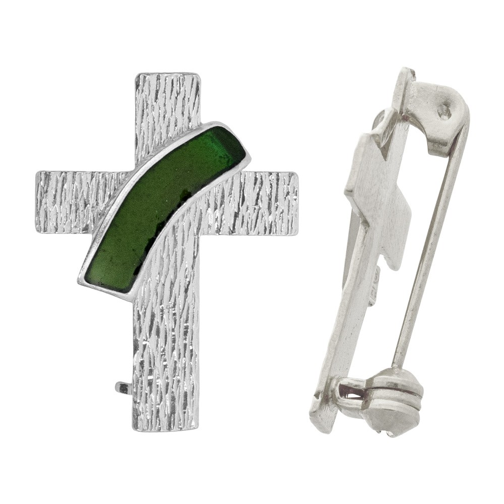 The cross is made of 925 sterling silver with green enamel, equipped with a pin closure.