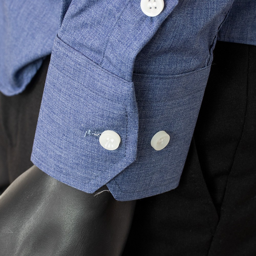 These long-sleeved clergy shirts are made of cotton blend and have a plain blue denim effect. Classic cut, matching buttons and buttonholes.