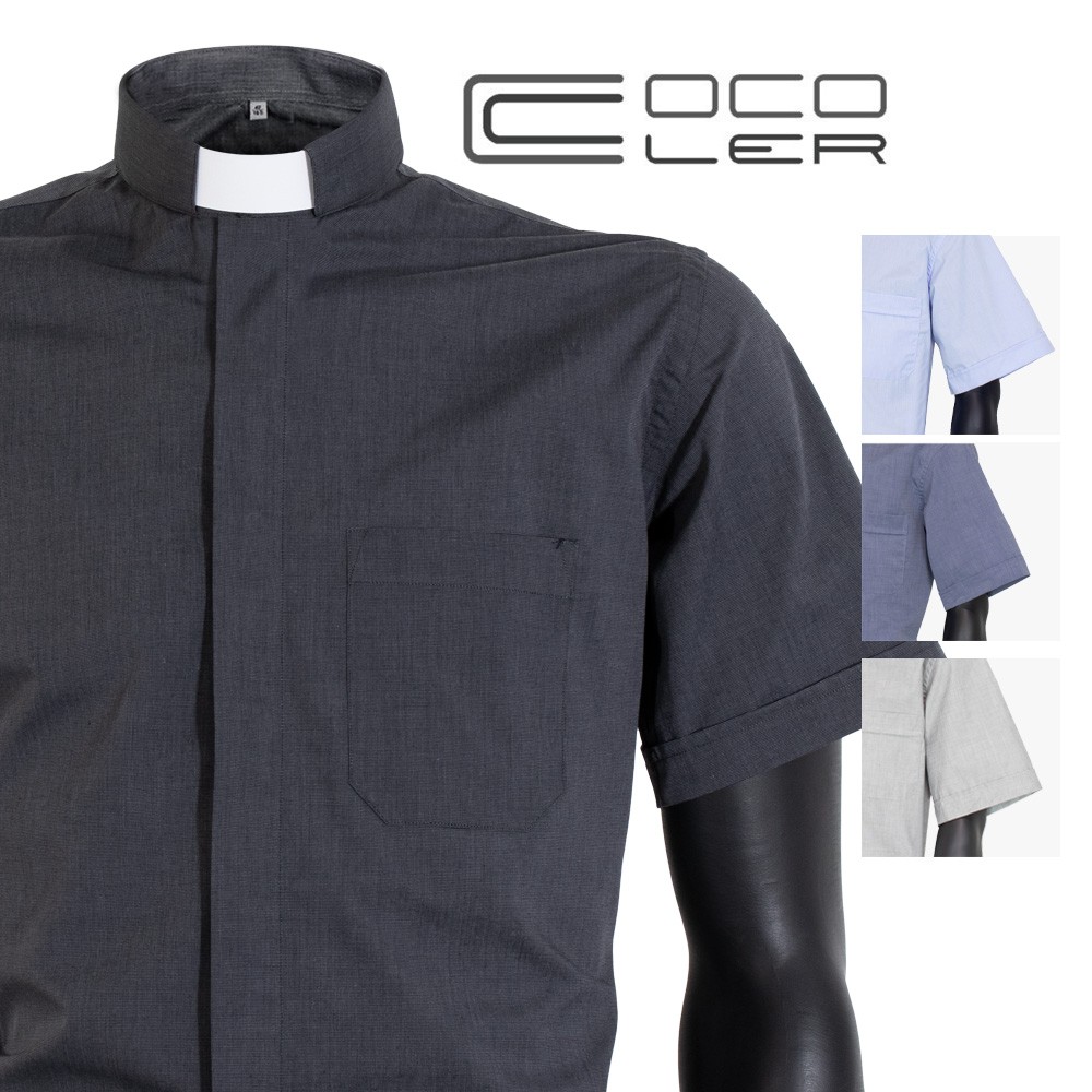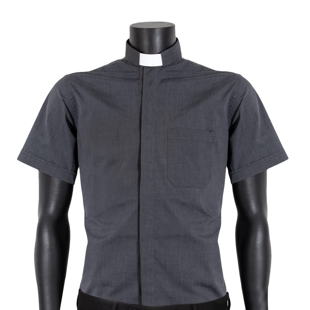 Clerical shirt with clergy collar in fil à fil cotton blend with short sleeves.
