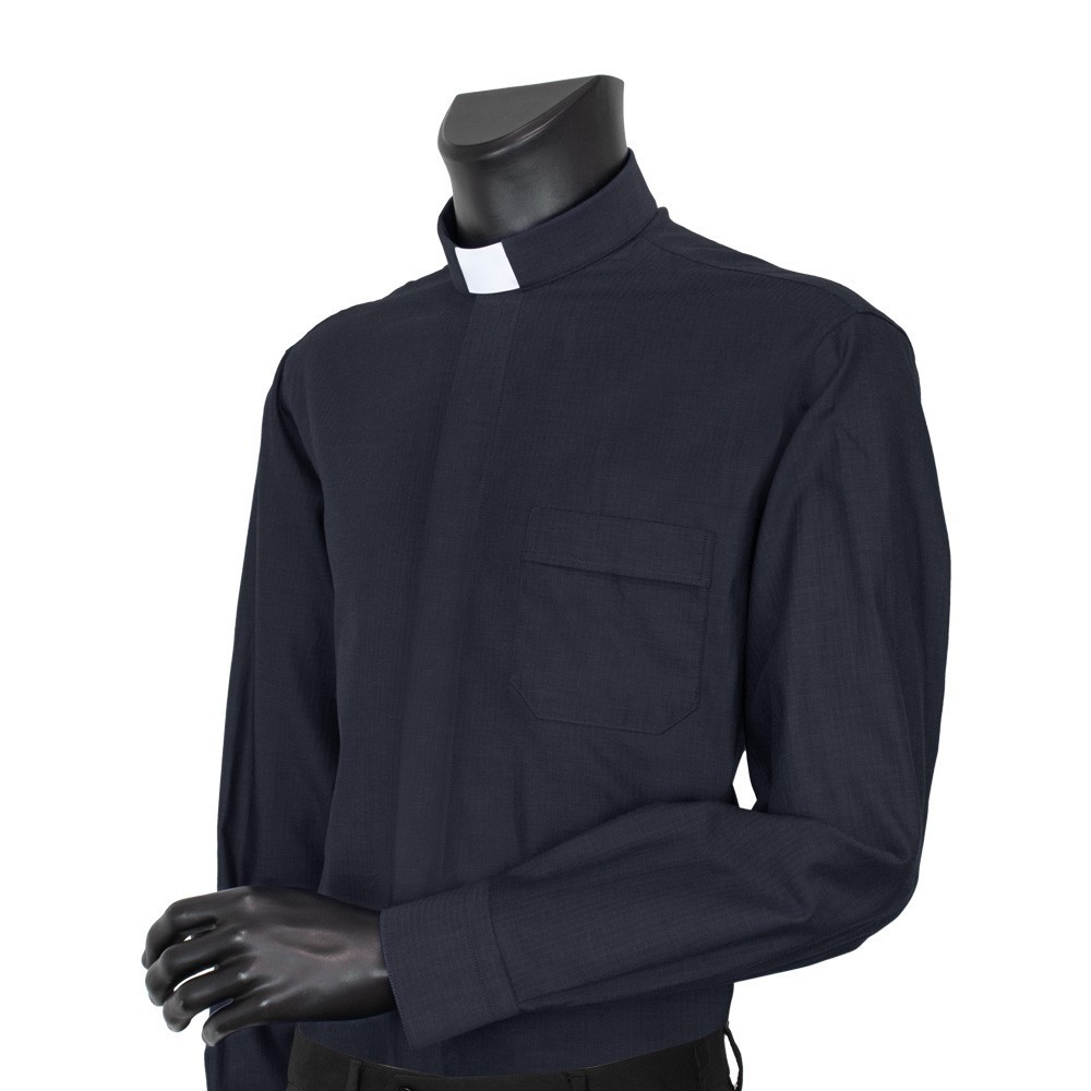 The shirt is designed with a classic white clergy collar, front buttons, long sleeves with double-button cuffs, and a left chest pocket.