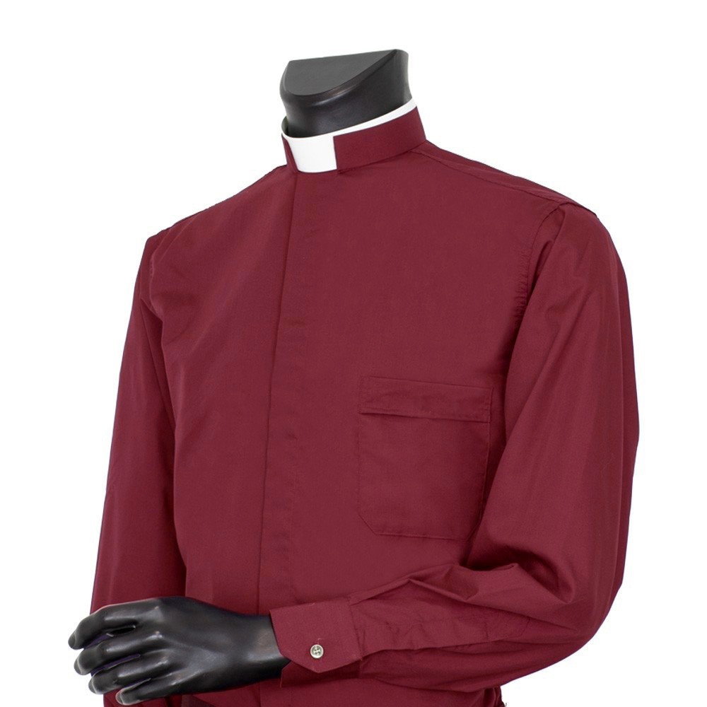 Burgundy priest shirt with semi-stiff Roman collar, long sleeves, and hidden buttons. Lightweight and breathable fabric. Made in Italy.