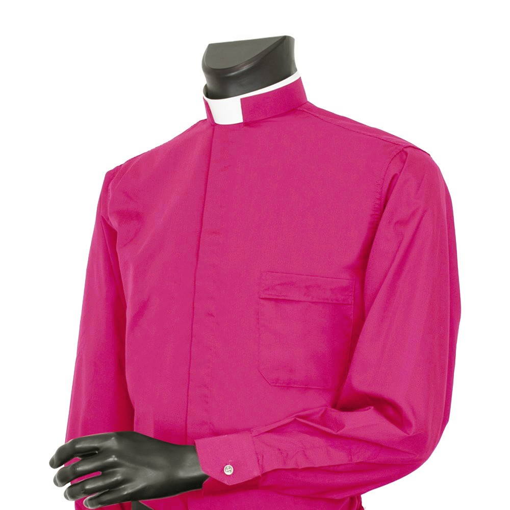 Burgundy priest shirt with semi-stiff Roman collar, long sleeves, and hidden buttons. Lightweight and breathable fabric. Made in Italy.
