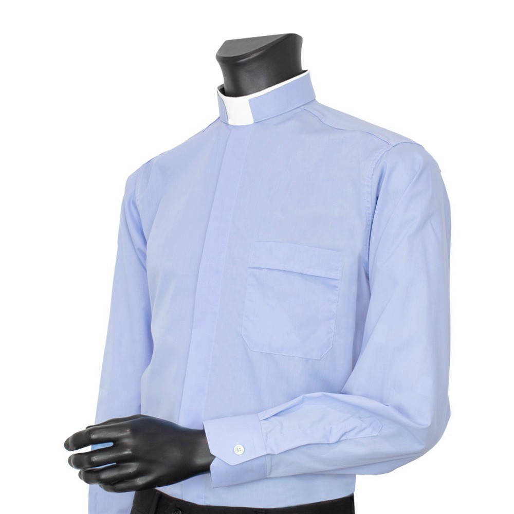 Light blue priest shirt with classic semi-stiff Roman collar.
