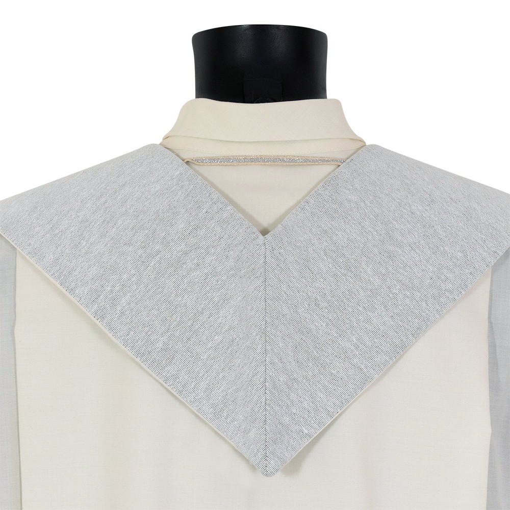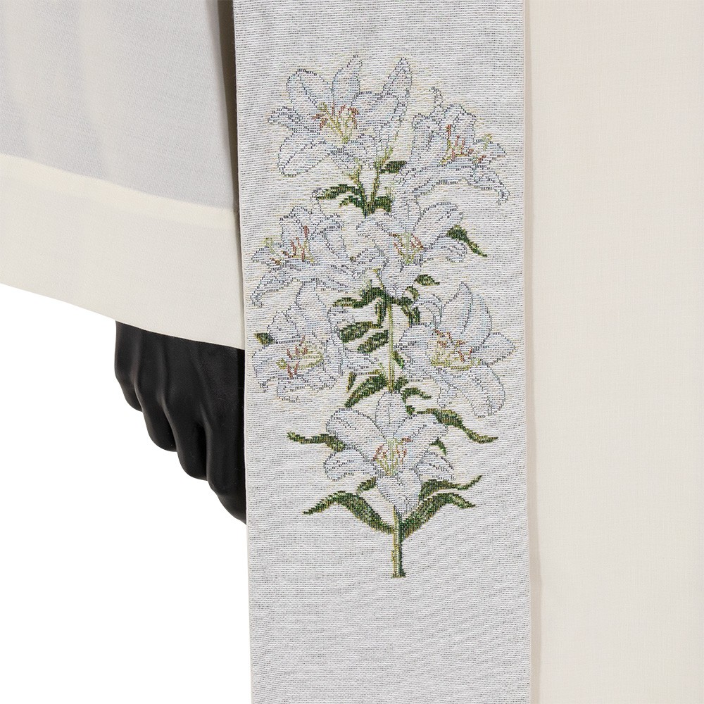 This elegant sacred vestment is made of cotton, polyester and lurex fabric blend.