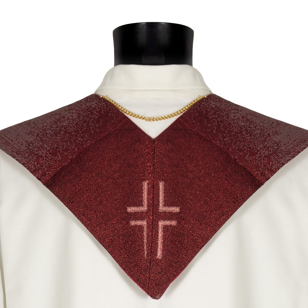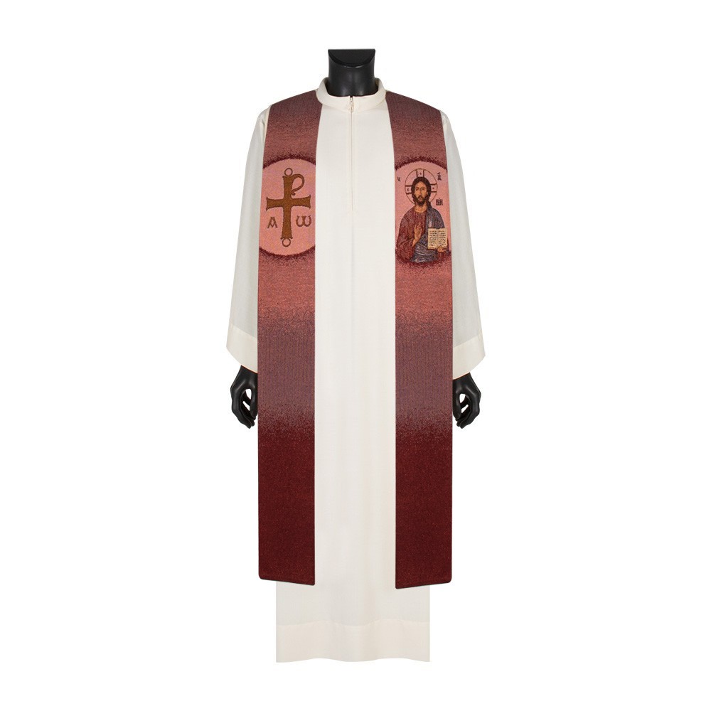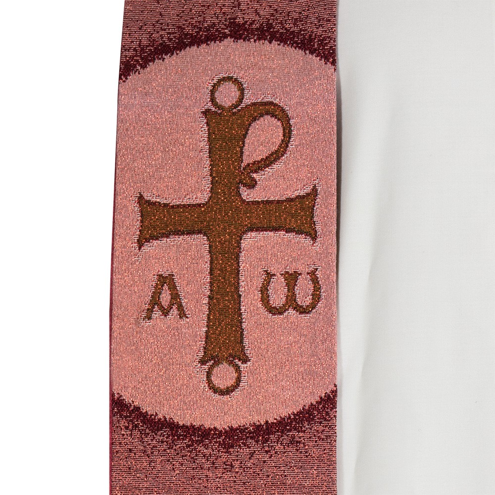 Red stole, finely embroidered with Christ Pantocrator on one side and a cross with Alpha and Omega symbols on the other side.