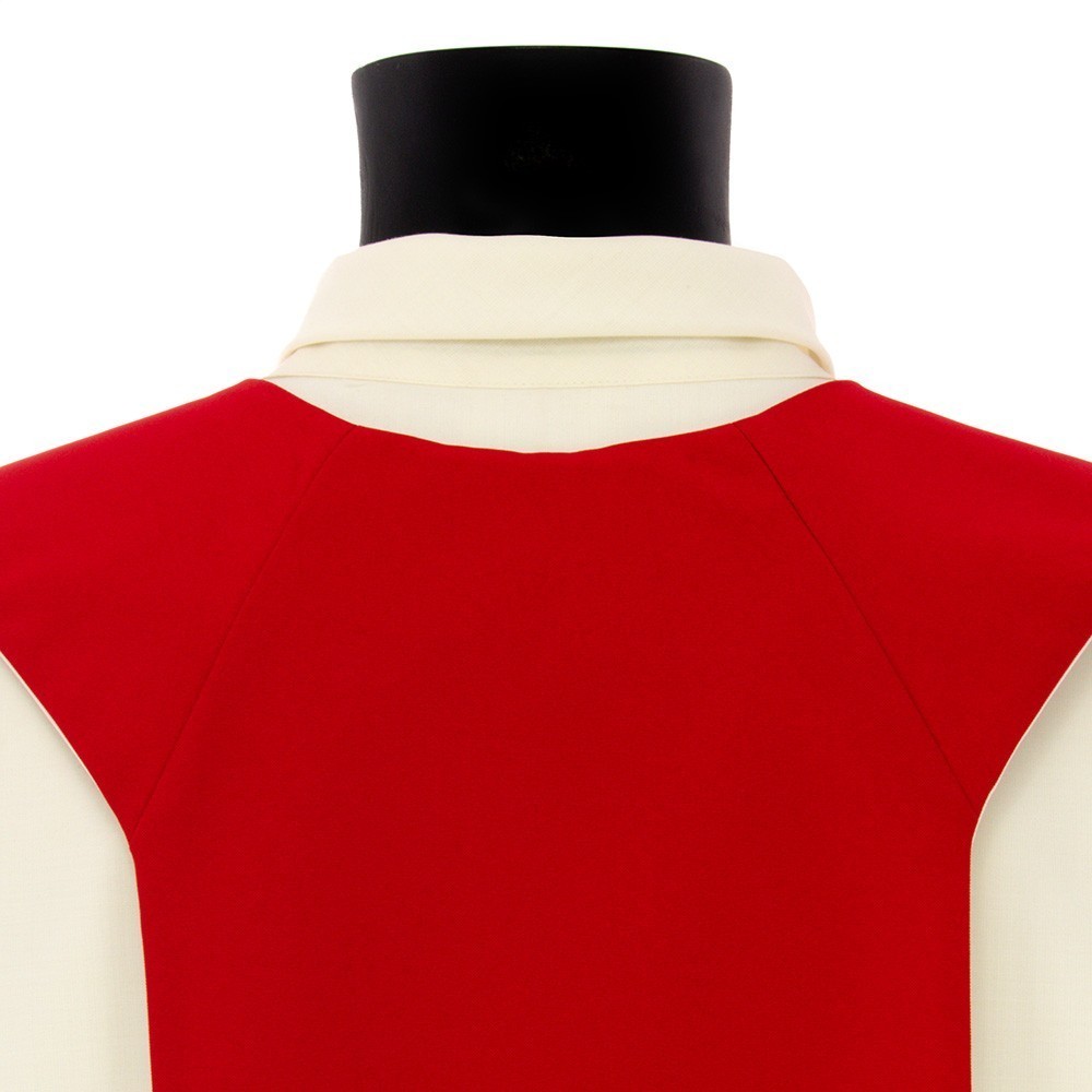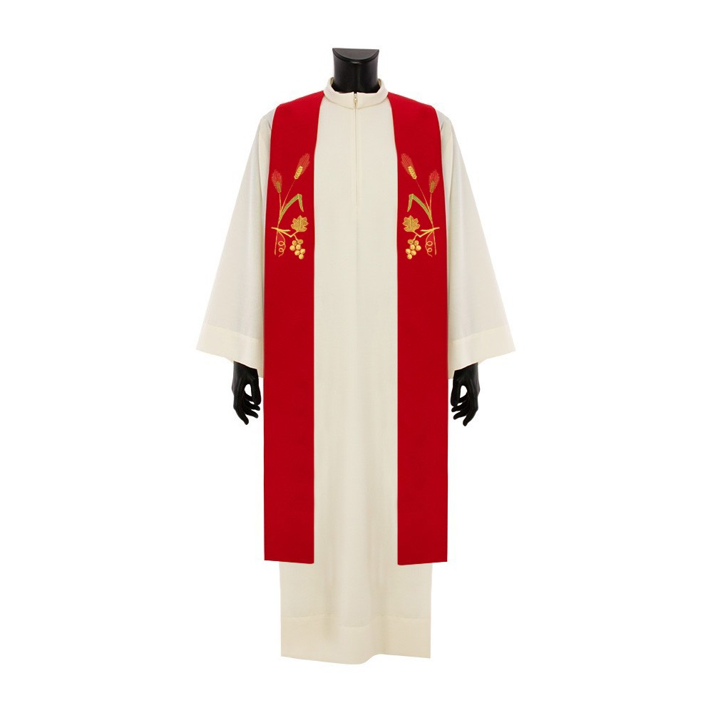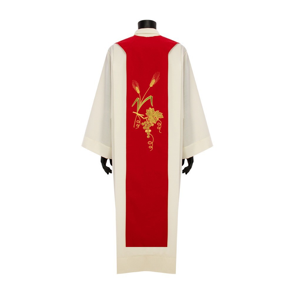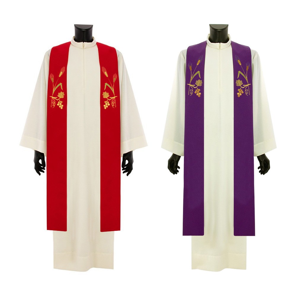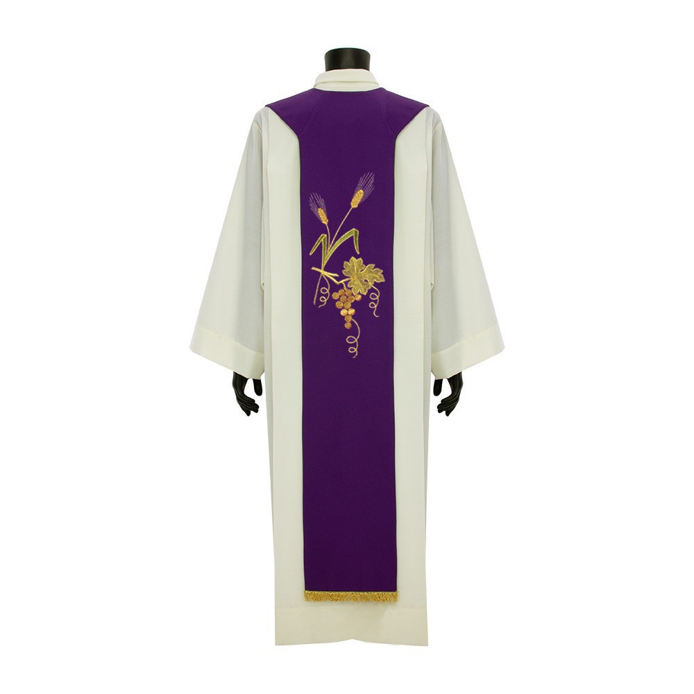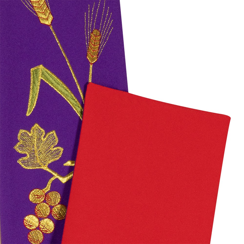 It can be worn on either the purple or red side, depending on the liturgical season. Both sides feature machine embroidery of wheat ears and grape clusters.