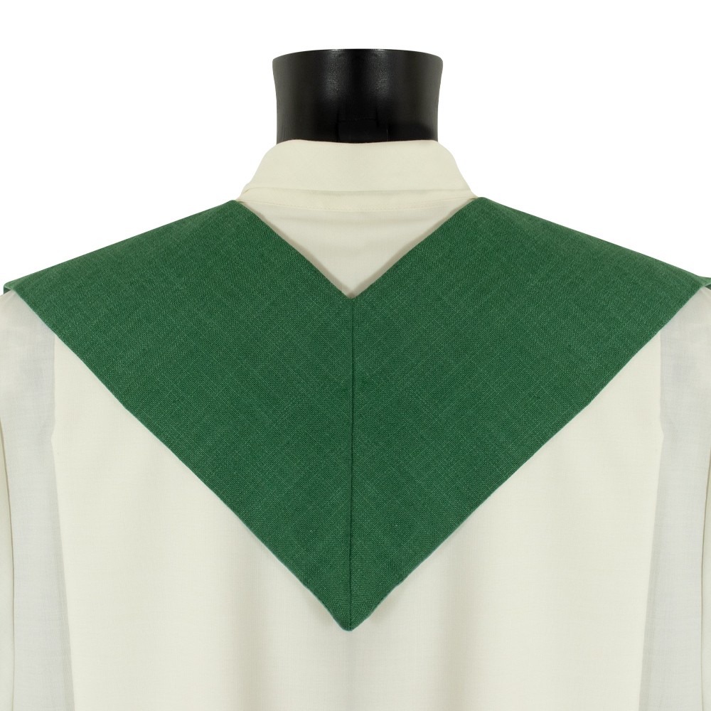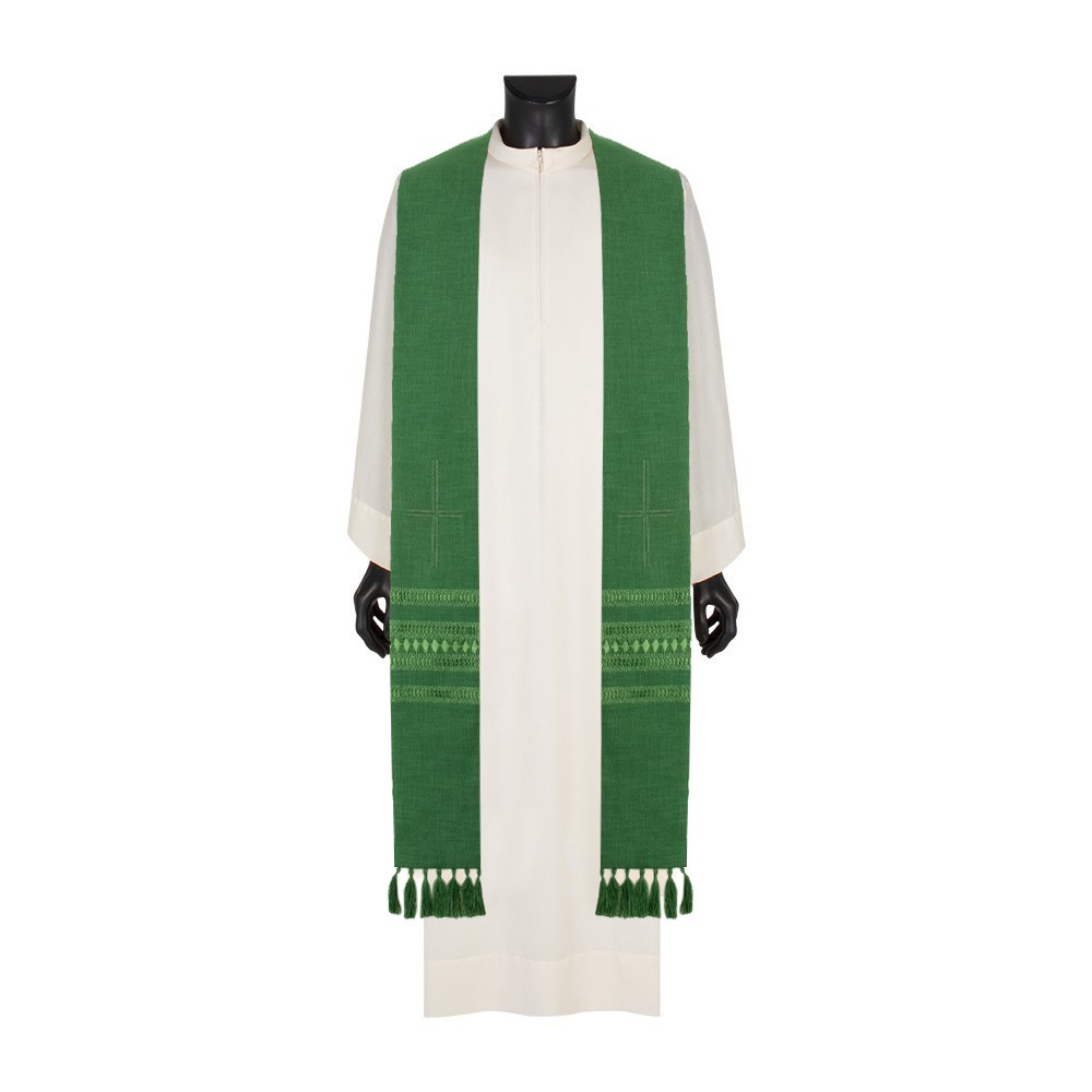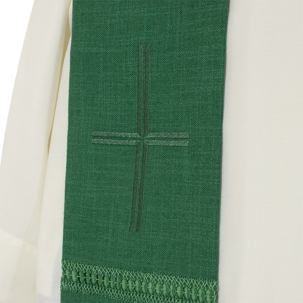 Sacred vestment made of fine and fresh fabric in linen blend and polyester with drawn thread work. Enriched by gigliuccio stitch.