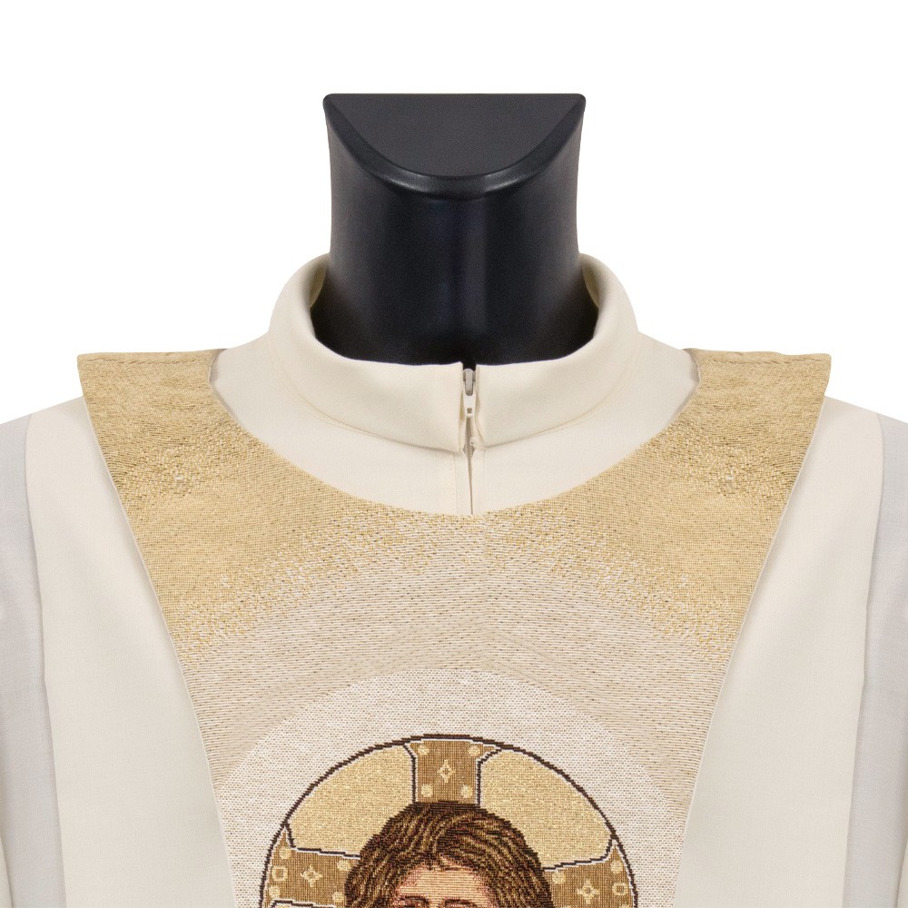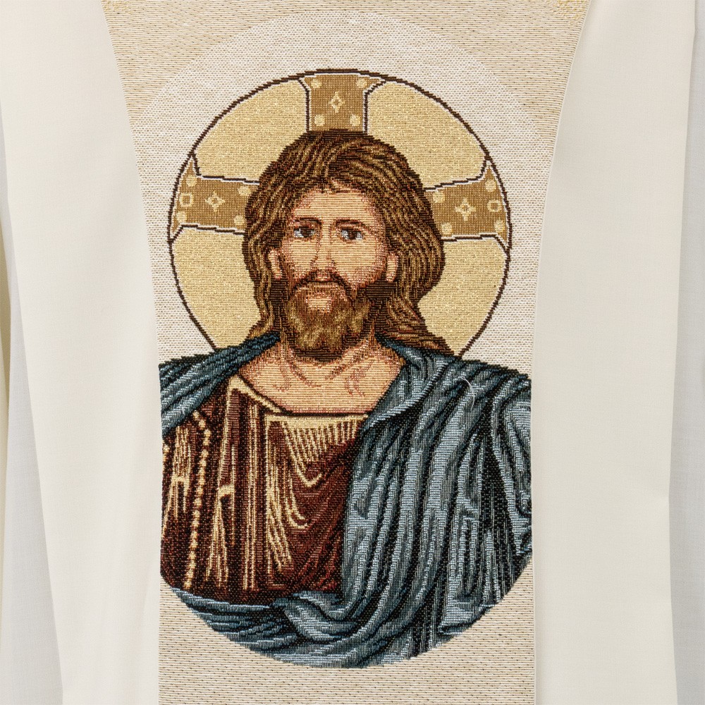Scapular with embossed embroidery of Christ Pantocrator on the front and Christogram on the back.