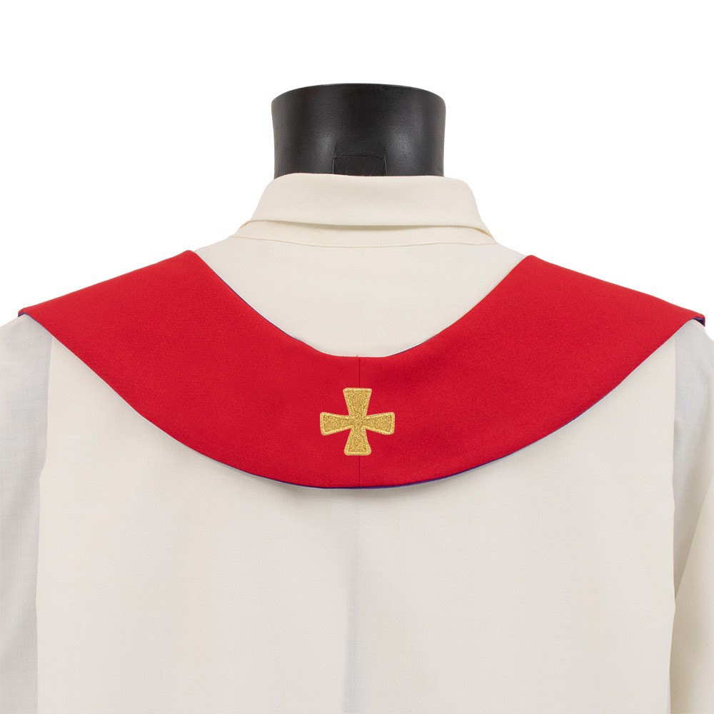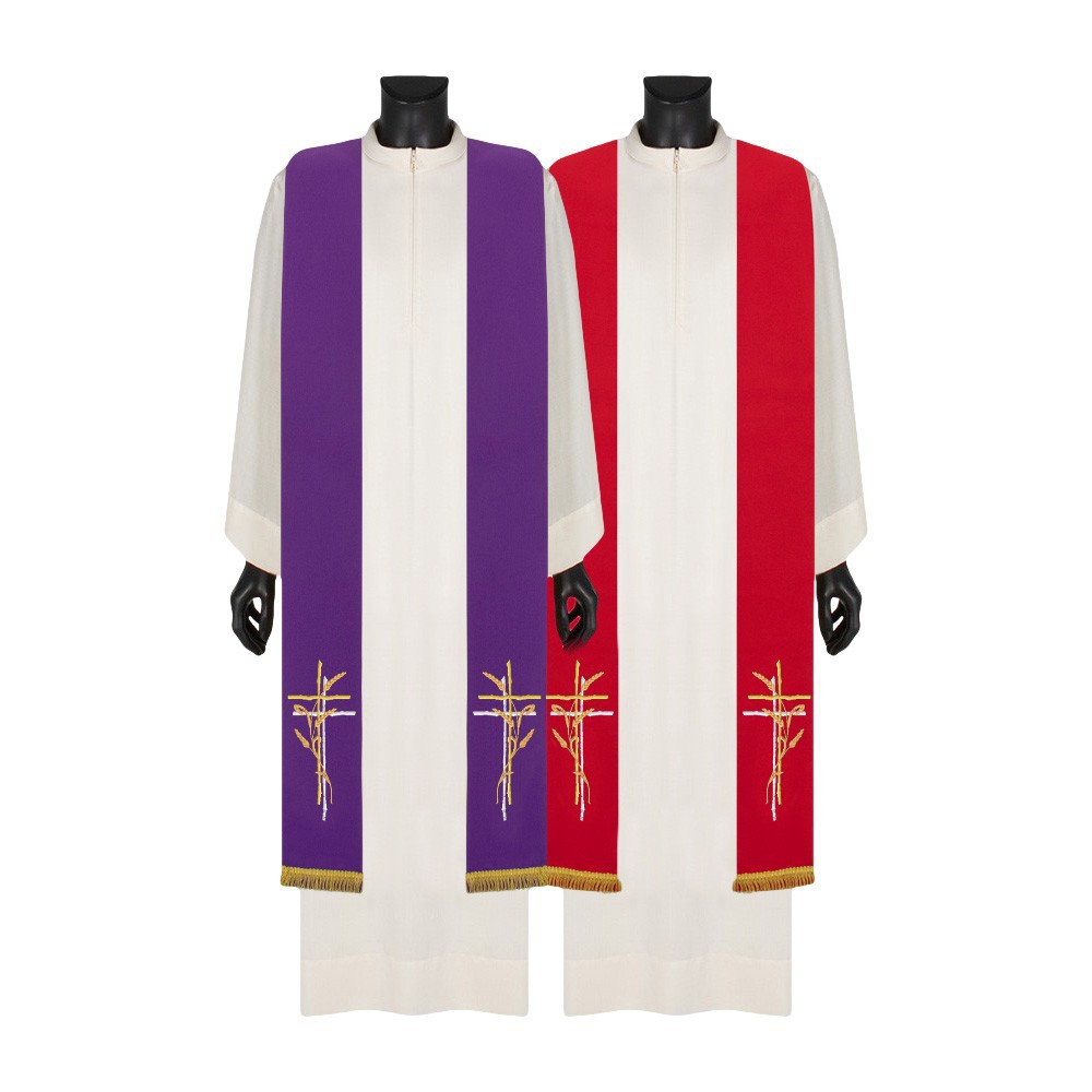 Double-sided liturgical stole of red and purple color, with embroidery and golden fringes.