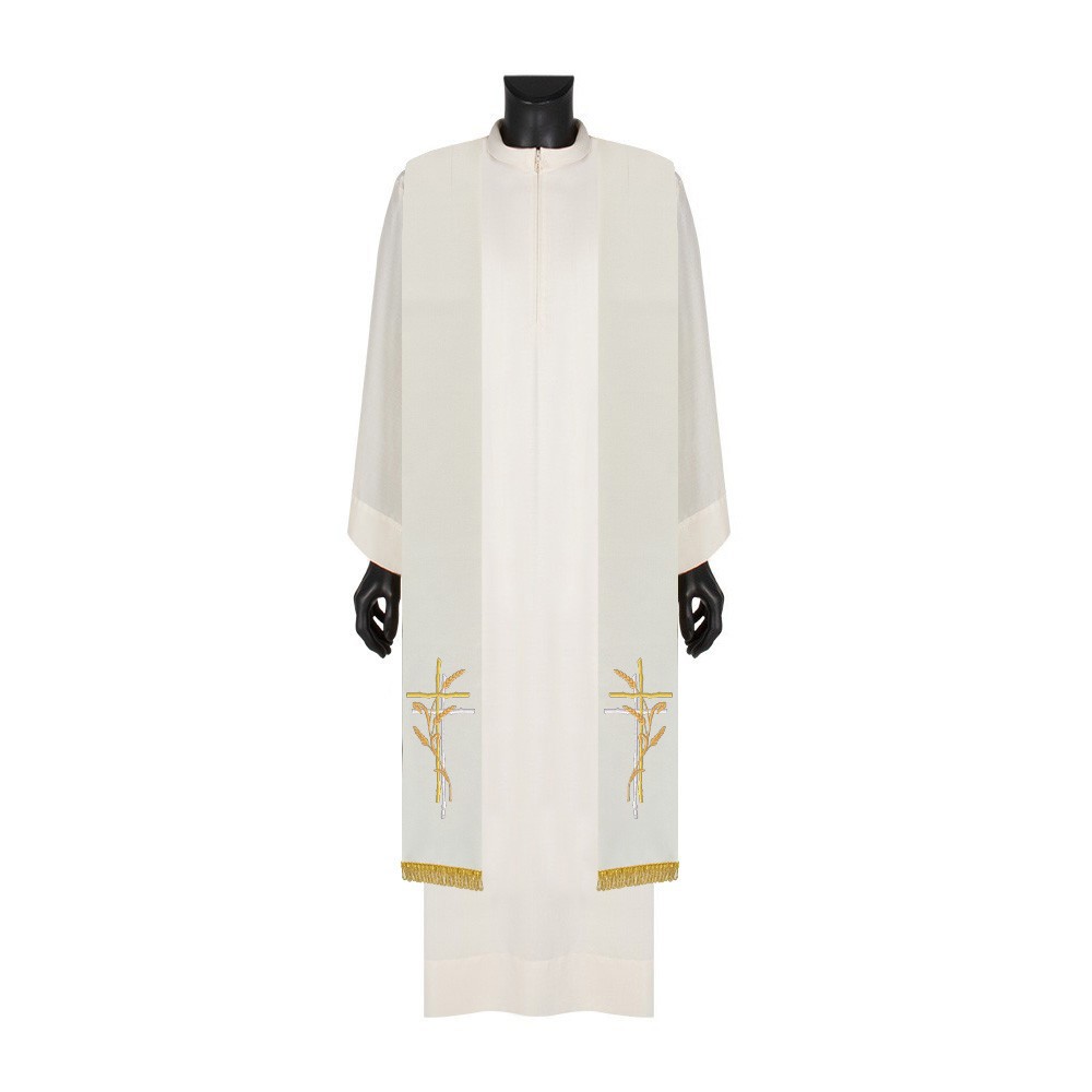 This stole features a stylized cross embroidery surrounded by ears of wheat on both sides and is enriched with golden fringes.