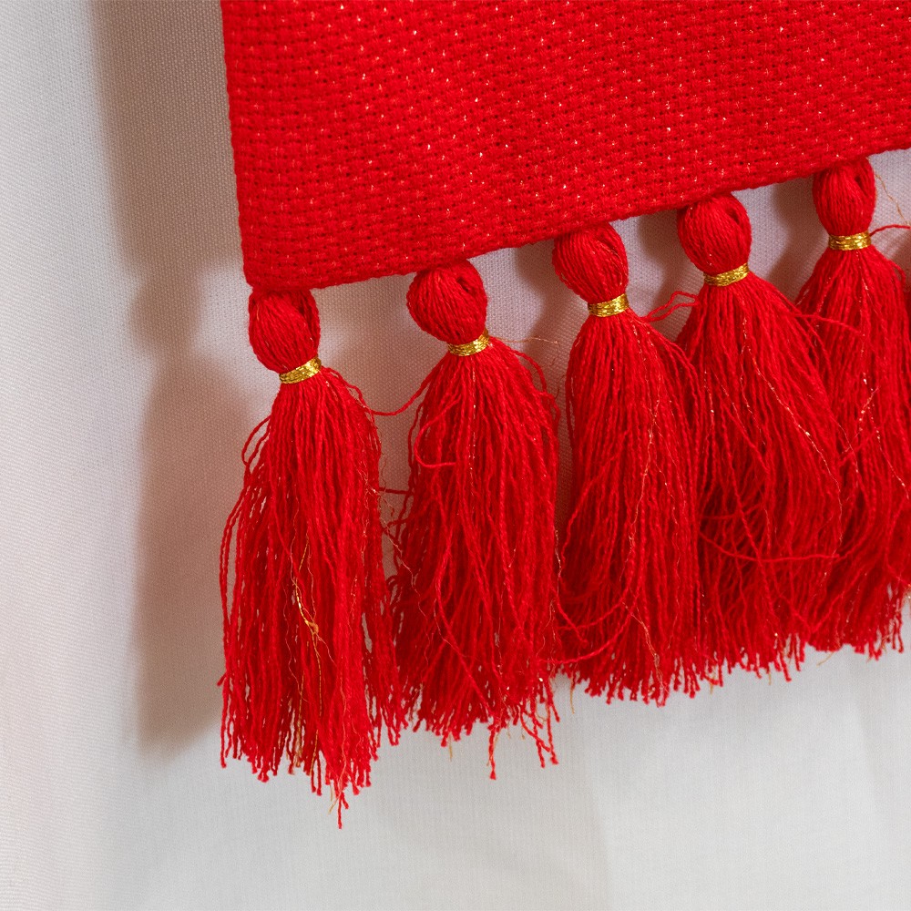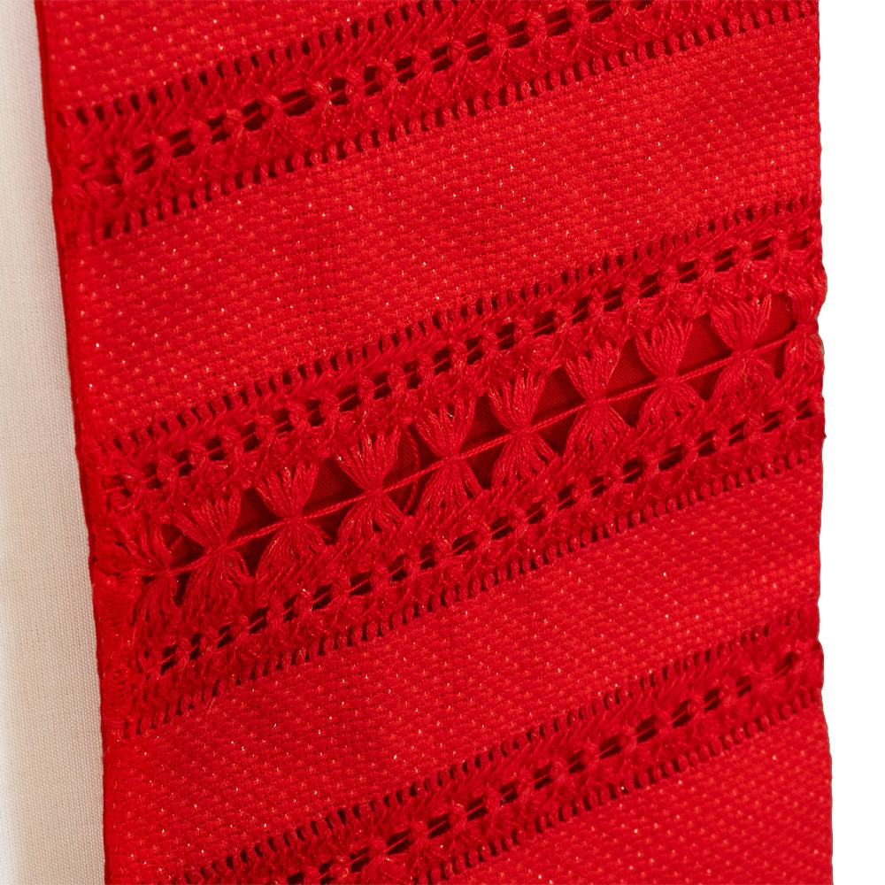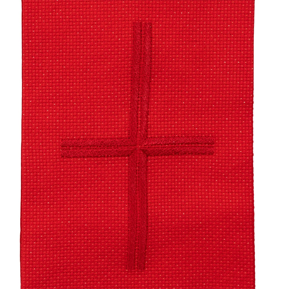 Fine red priest stole made from lightweight linen, polyester, and lurex fabric.