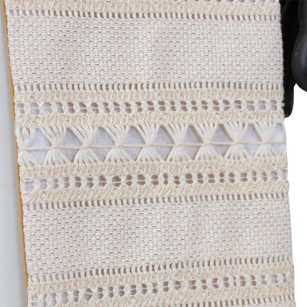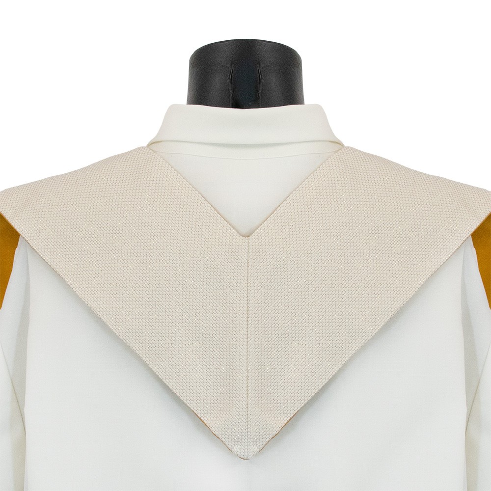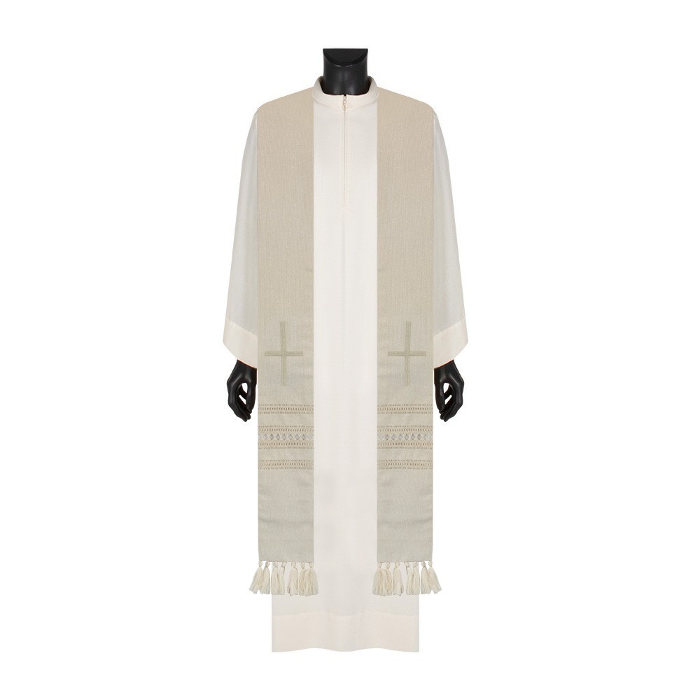 This fine priest stole is made from lightweight linen, polyester, and lurex fabric.