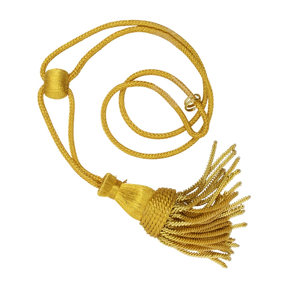 Elegant gold shiny cord tie for priestly stoles, adorned with a wooden helix knot made of bullion wire.