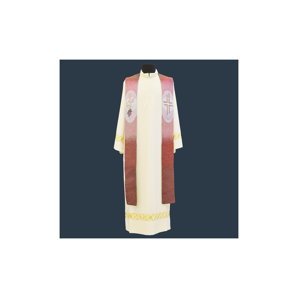 Stola bicolore per sacerdote in misto cotone/lurex, con ricami che rappresentano i simboli eucaristici. Il tessuto è elegante e resistente. Disponibile nei vari colori liturgici. Può essere usata sia dal lato avorio che dal lato rosso, a seconda dell'occasione. Made in Italy.