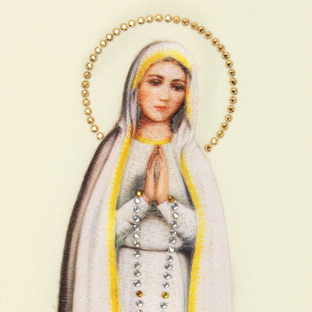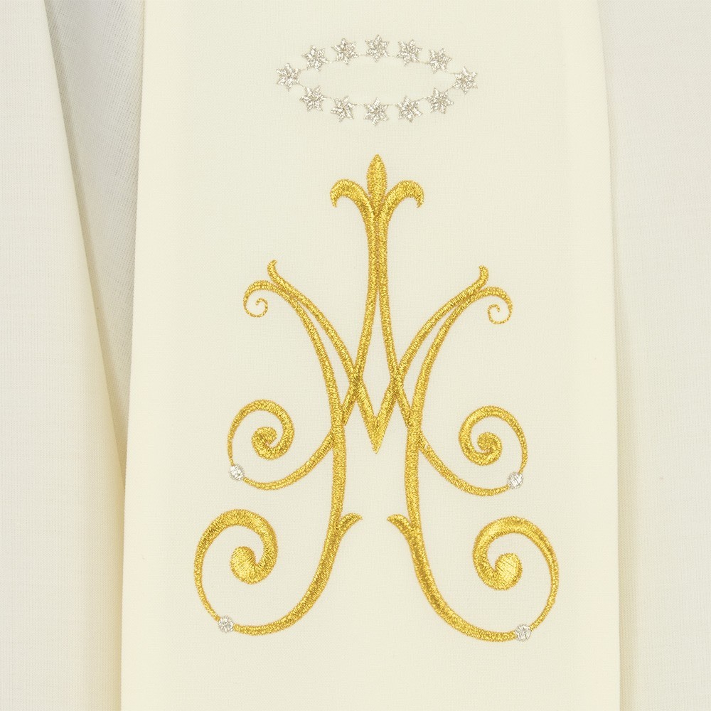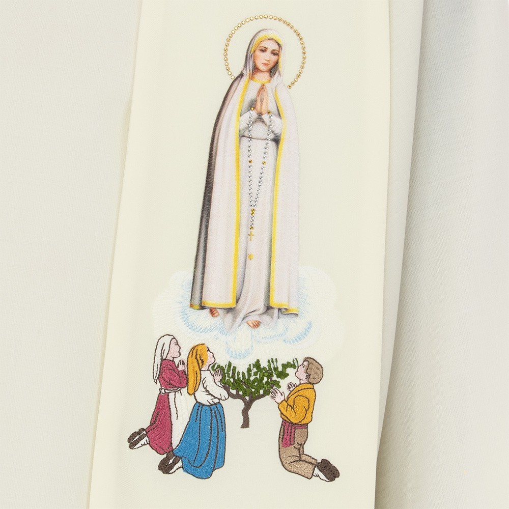Questa stola presenta un grazioso e fine ricamo raffigurante da un lato l'immagine della Madonna di Fatima con i tre pastorelli e dall'altro il ricamo mariano.