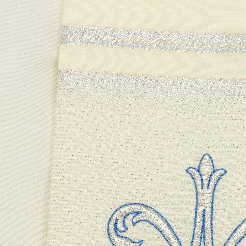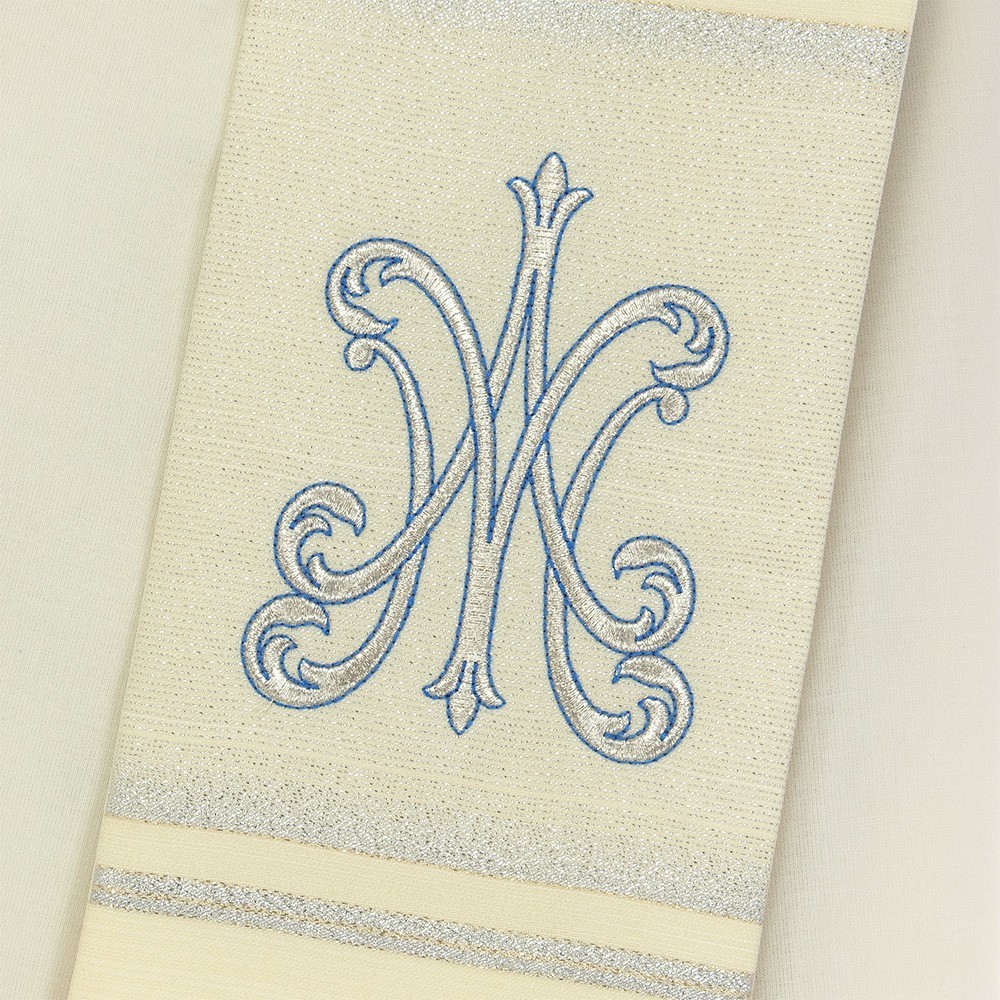 Stola con monogramma Mariano in pregiato e ricercato tessuto in lana e seta. Il ricamo mariano viene seguito a macchina con cura e precisione, con filati in seta blu e argento. Made in Italy.