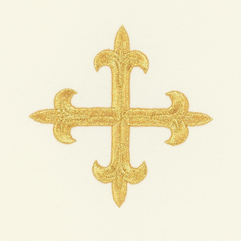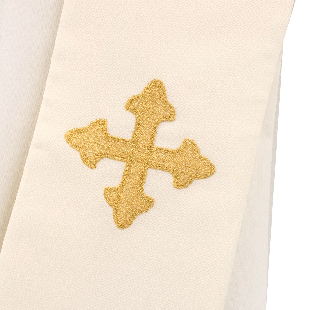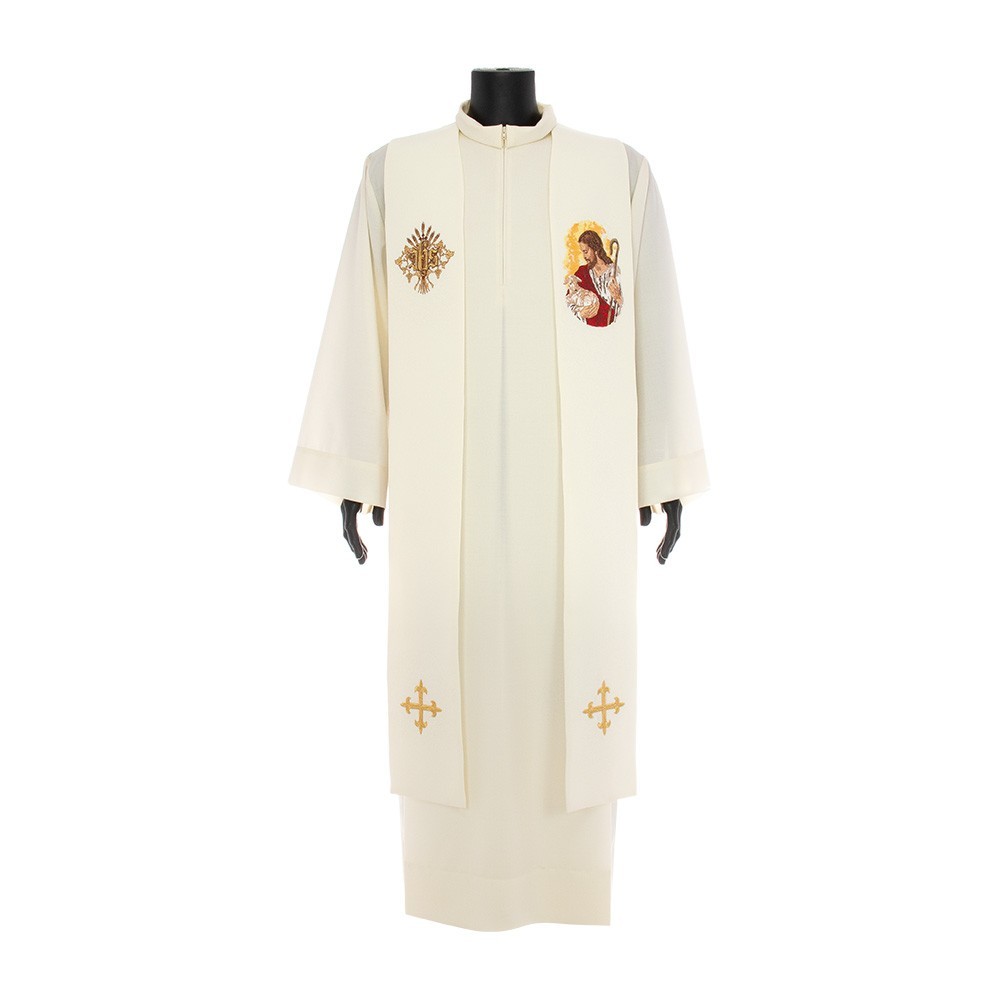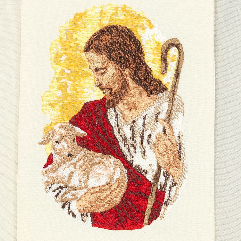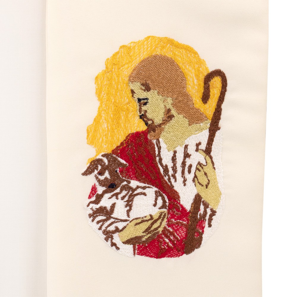 Priest stole with embroidery of Jesus the Good Shepherd. This stole features two different decorations. On one side of the stole there is the embroidery of Jesus the Good Shepherd, whereas the other side is enriched with the JHS inscription surrounded by ears of wheat and a bunch of grapes. Fabric composition: 80% polyester and 20% wool..