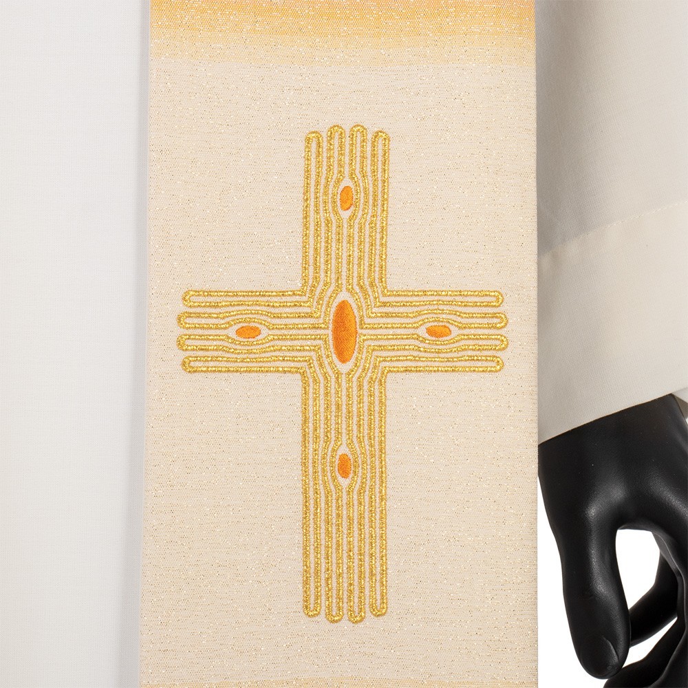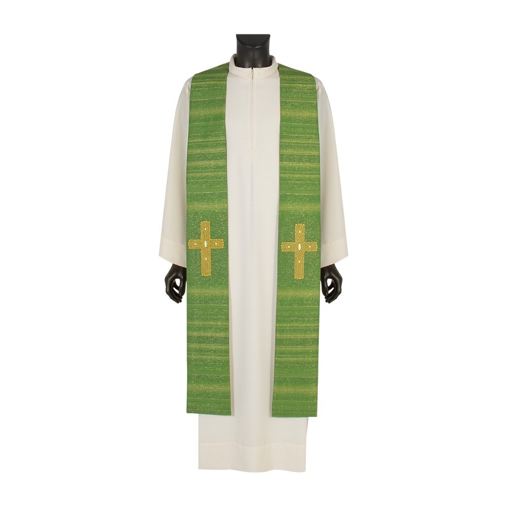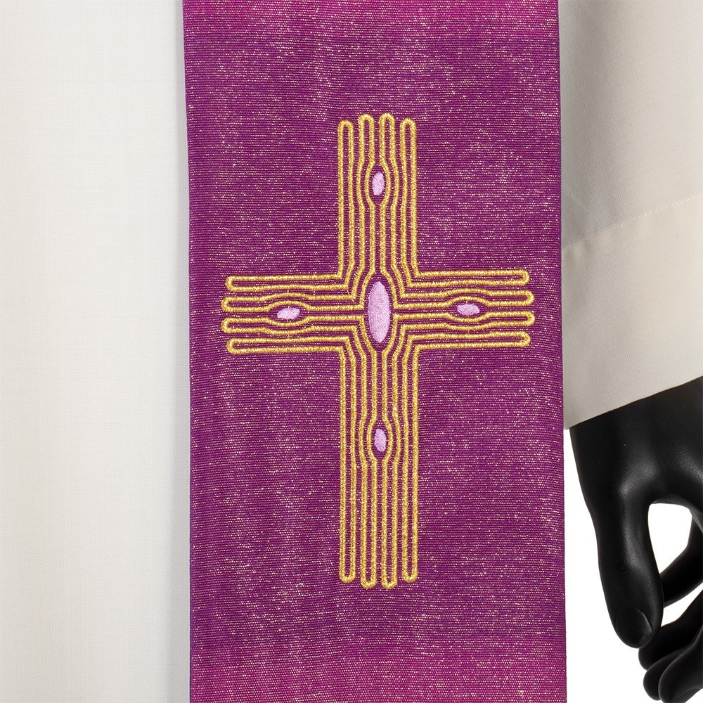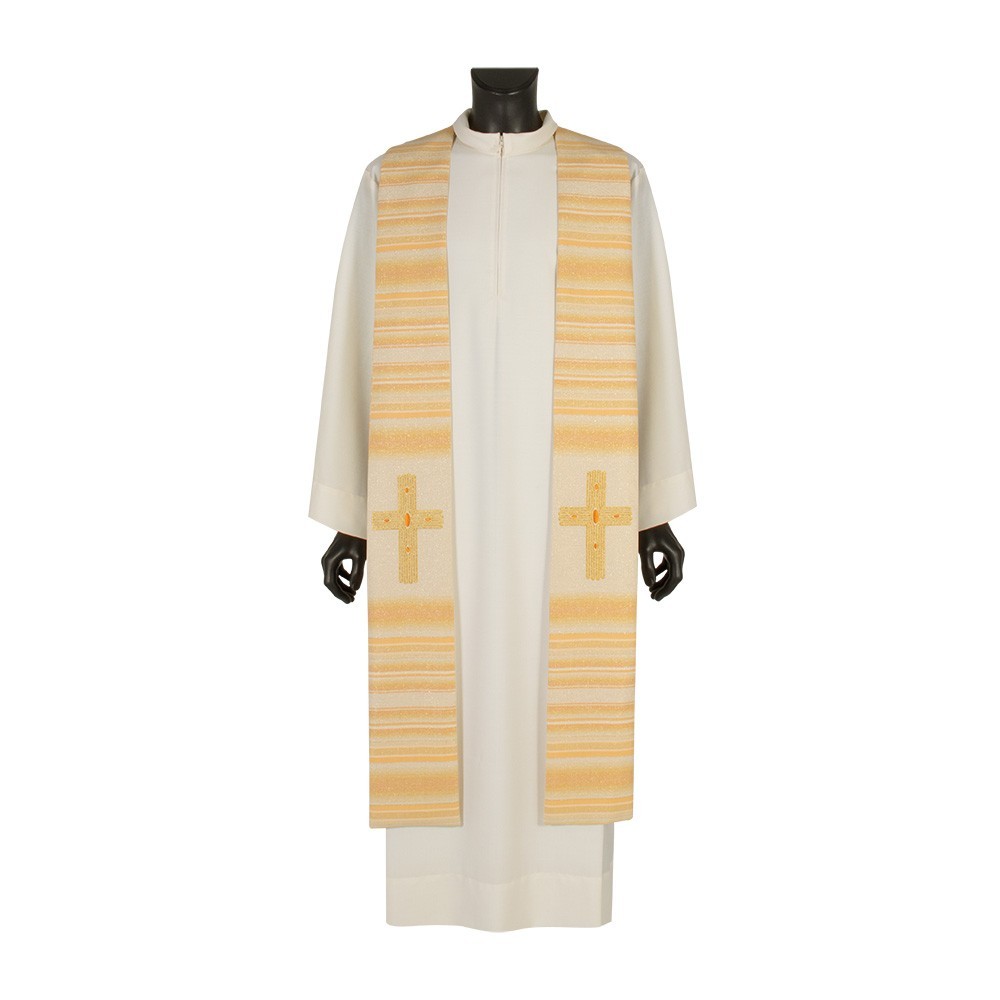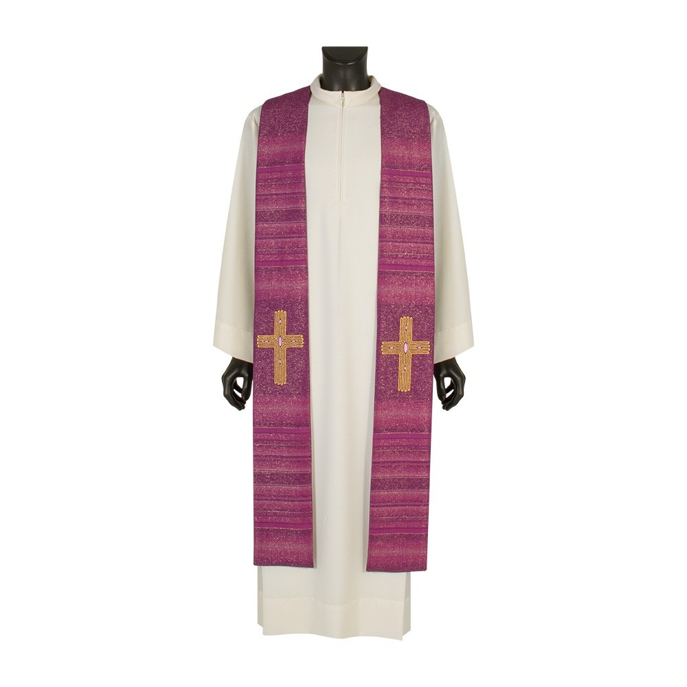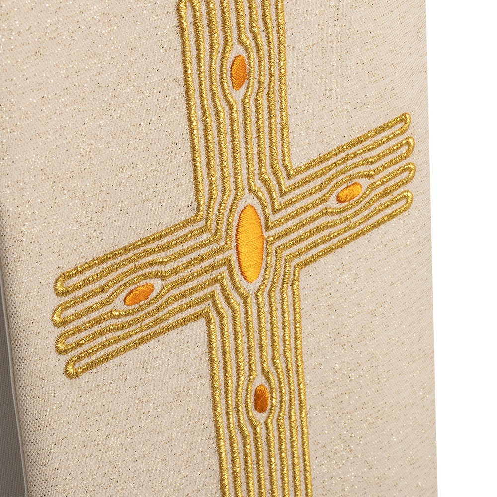 Liturgical stole with simple and fine embroidery depicting a cross. The embroidery is applied on both sides of the stole and is made by machine. Made of light fabric – 60% wool, 25% silk and 15% lurex. Made in Italy.