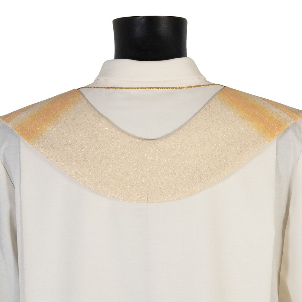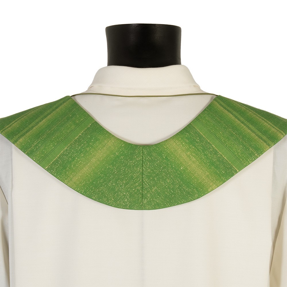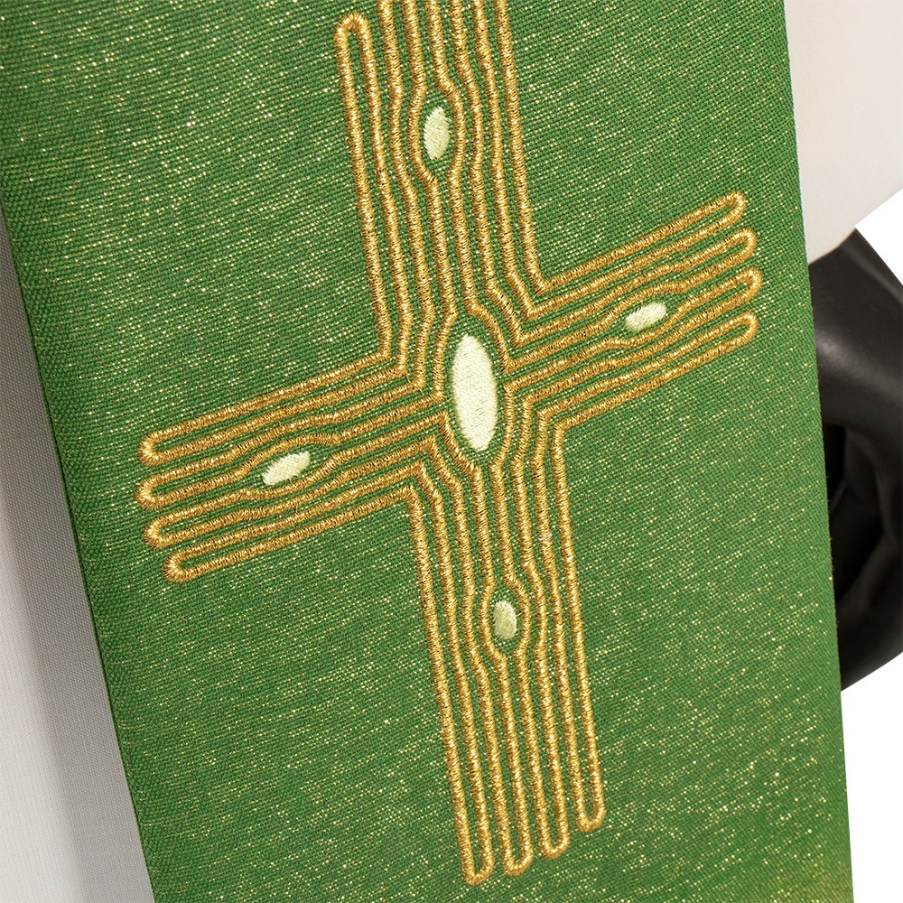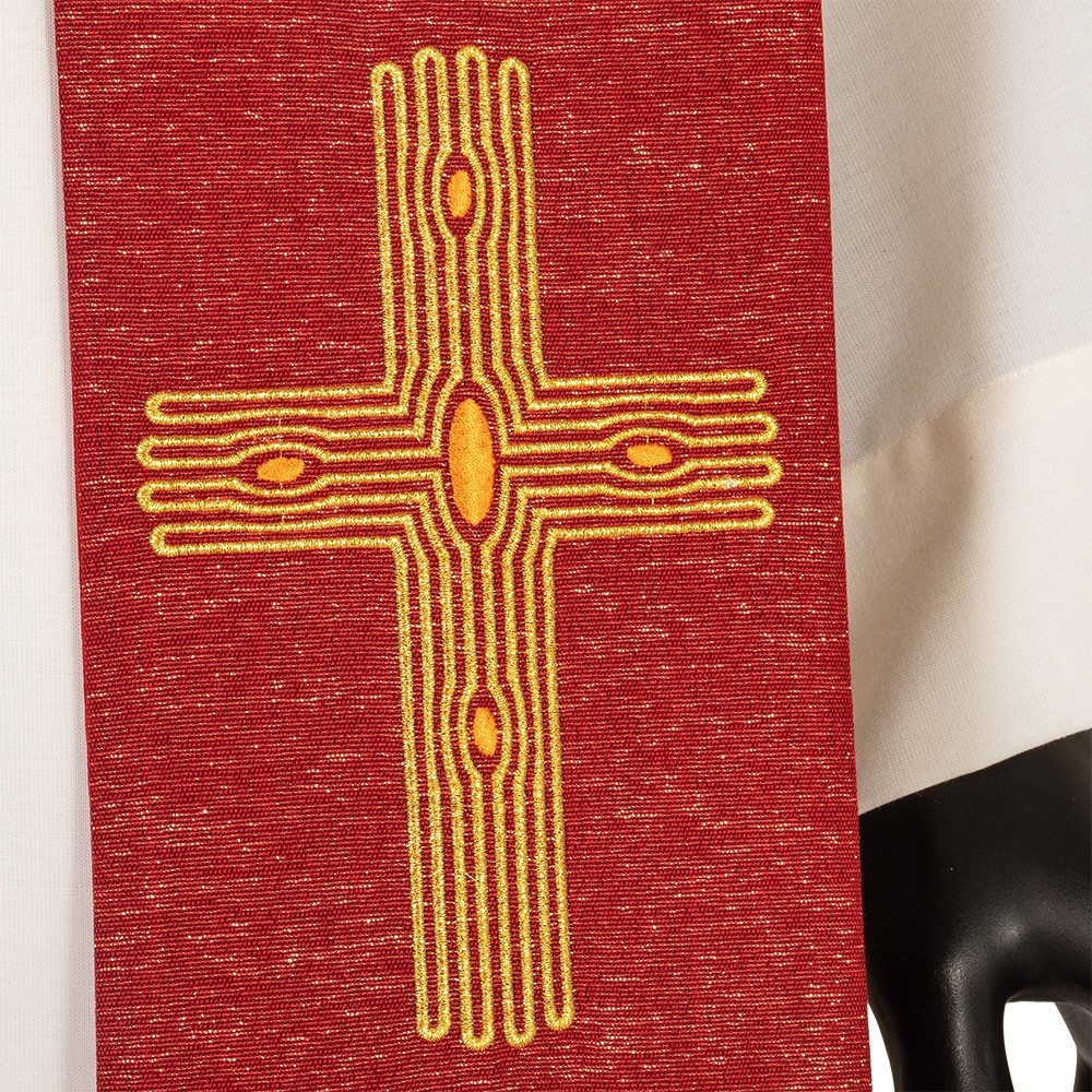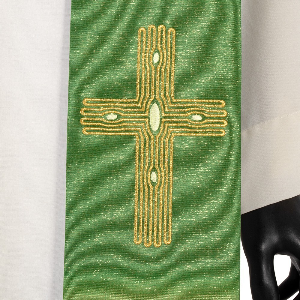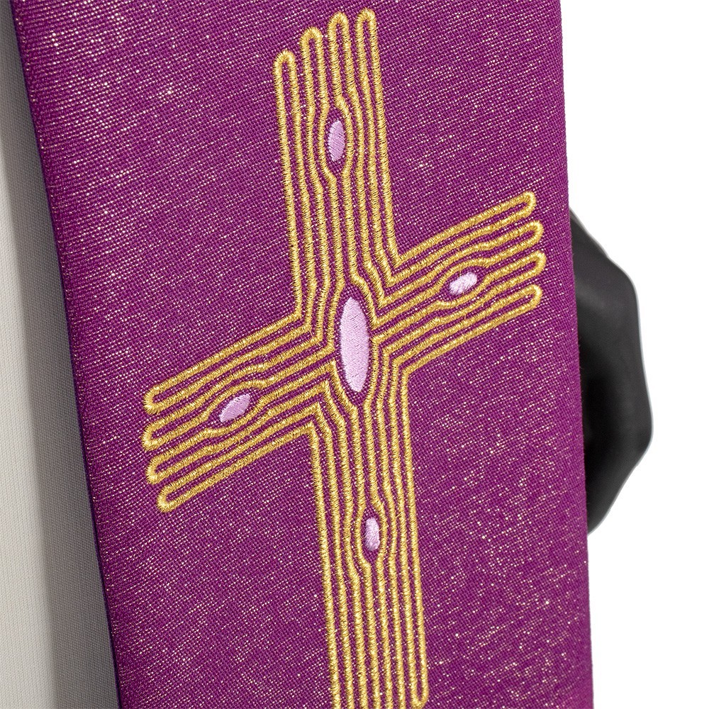 Liturgical stole with simple and fine embroidery depicting a cross. The embroidery is applied on both sides of the stole and is made by machine. Made of light fabric – 60% wool, 25% silk and 15% lurex. Made in Italy.