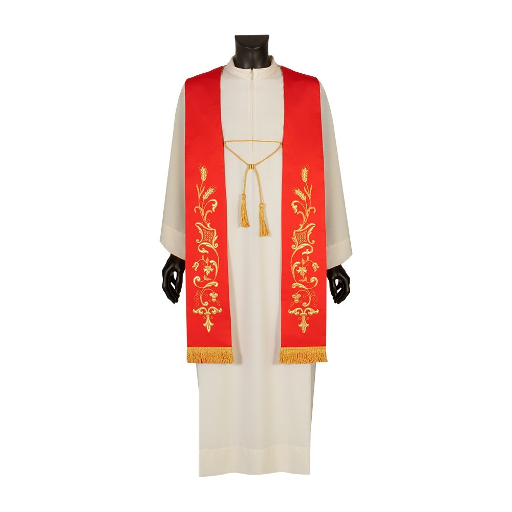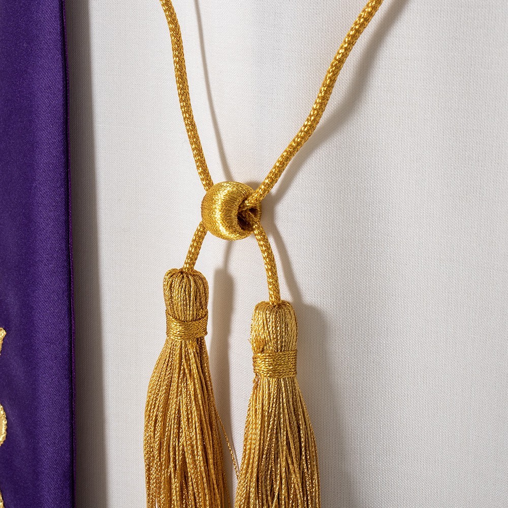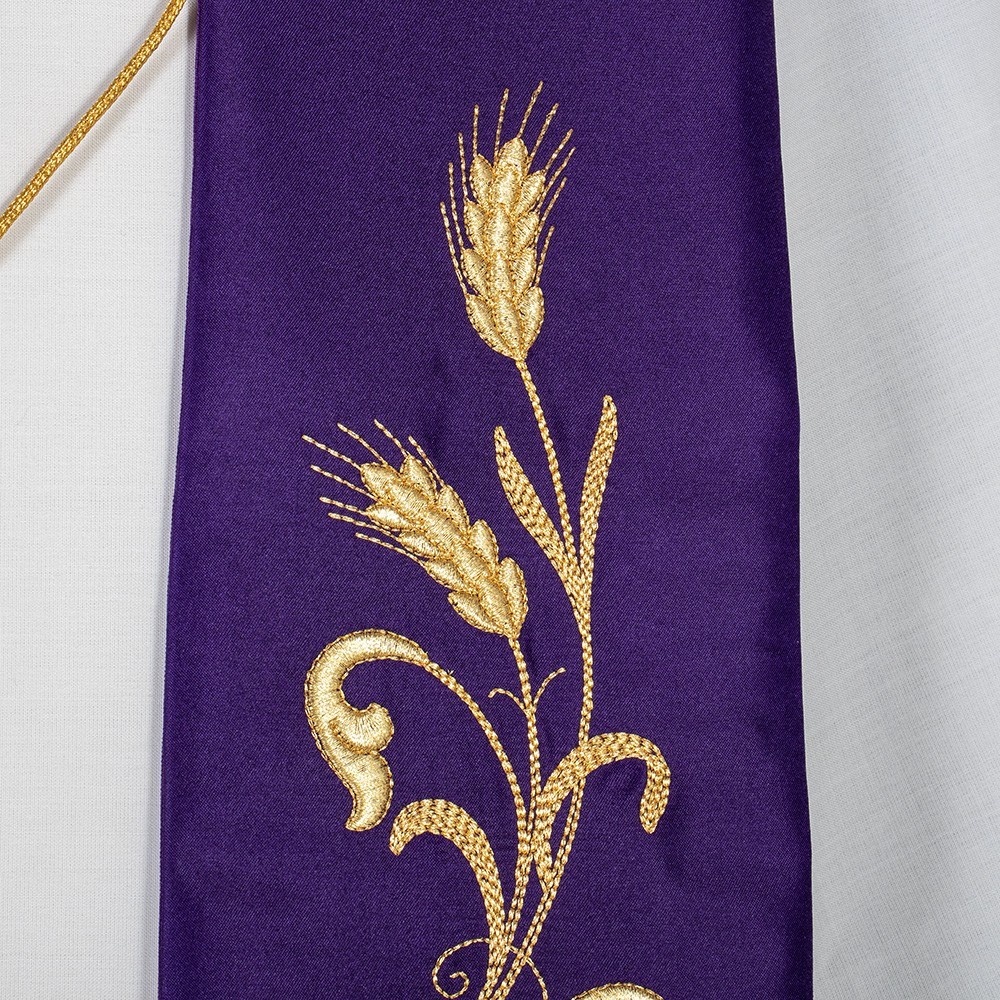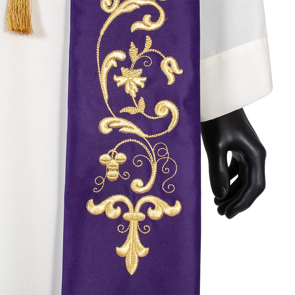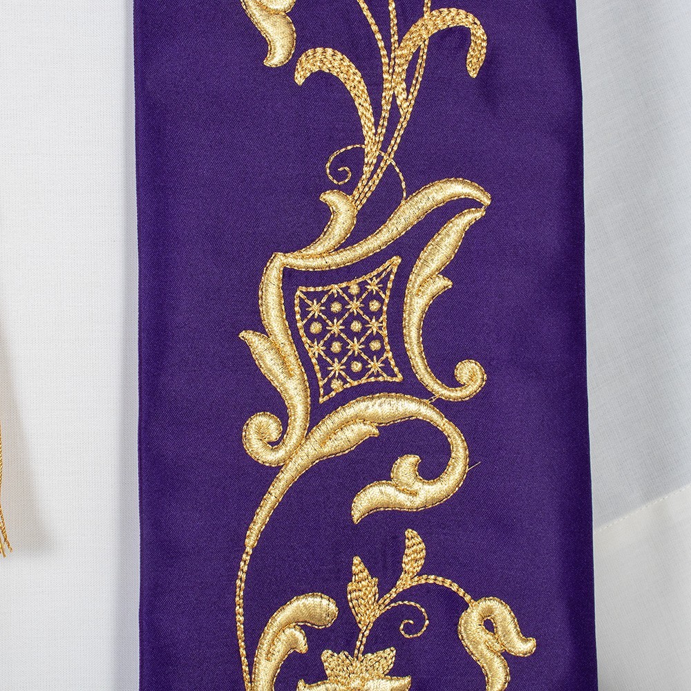 Liturgical stole made of 100% polyester, complete with golden fringe. Available in four liturgical colors. Both parts of the stole feature a gold yarn embroidery.