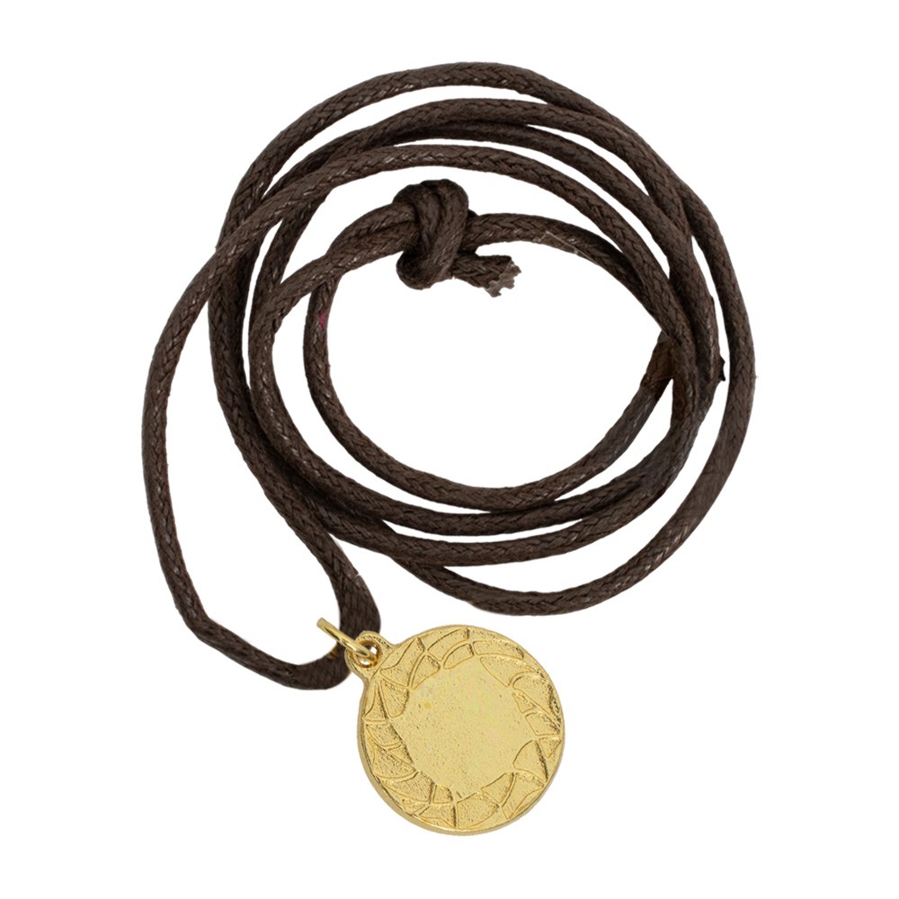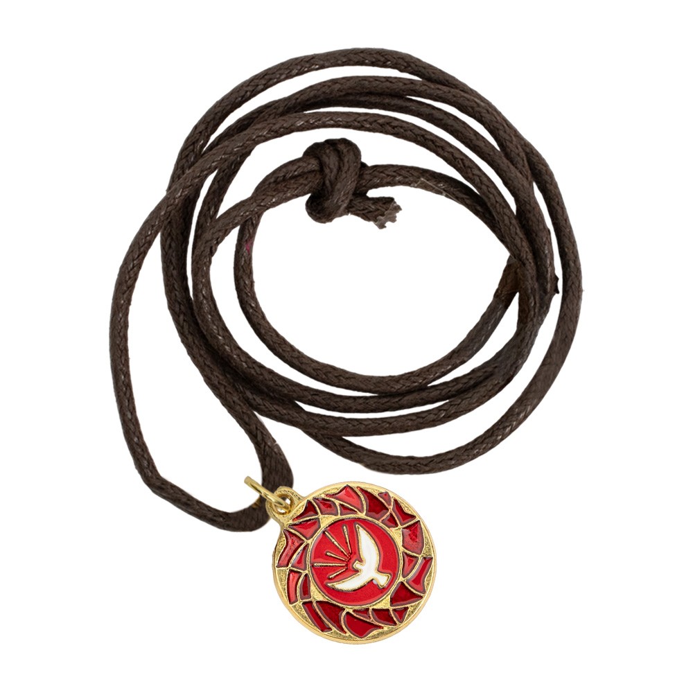 This pendant features an engraved dove at the center, made of gold-colored metal with white and red enamel. It comes complete with a brown cord for wearing.