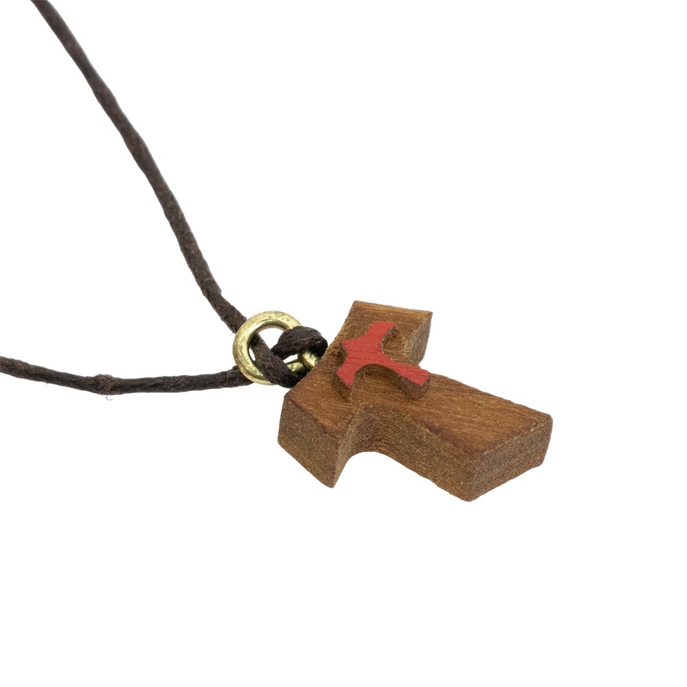 The pendant is entirely made of dark wood in the shape of a tau, with a dove (Holy Spirit) in relief.