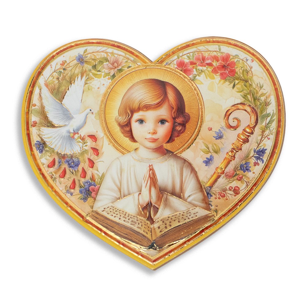 This heart-shaped magnet is a special keepsake for the Sacrament of Confirmation, made from molded polymer with intricate raised details. A perfect gift for confirmands.