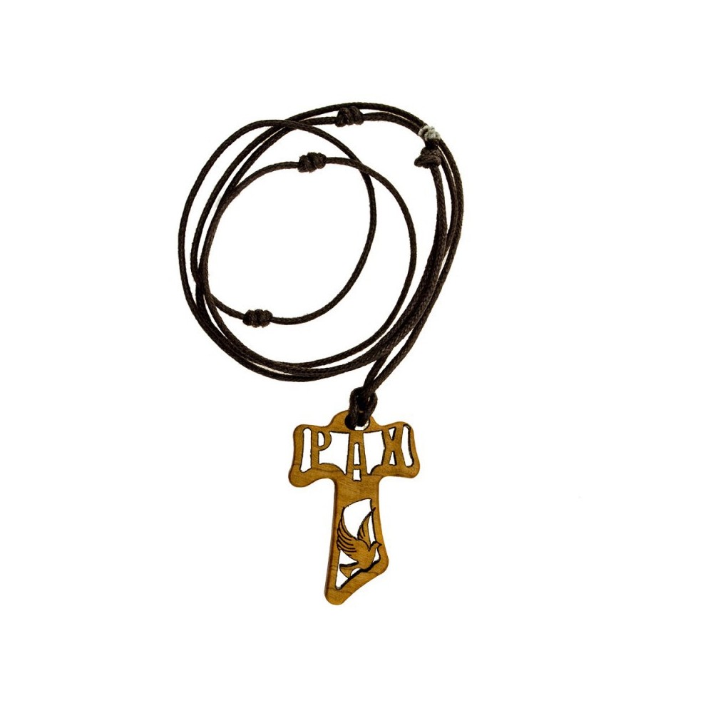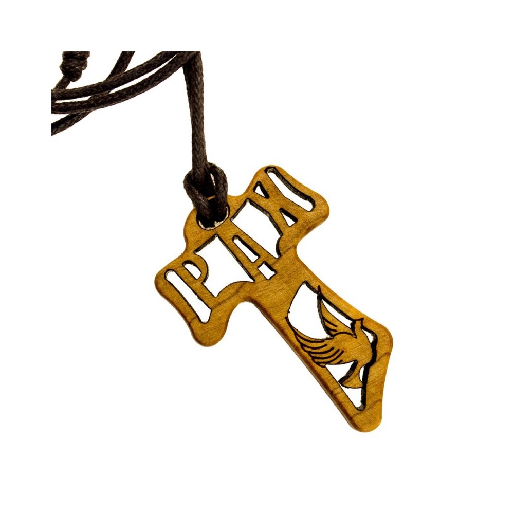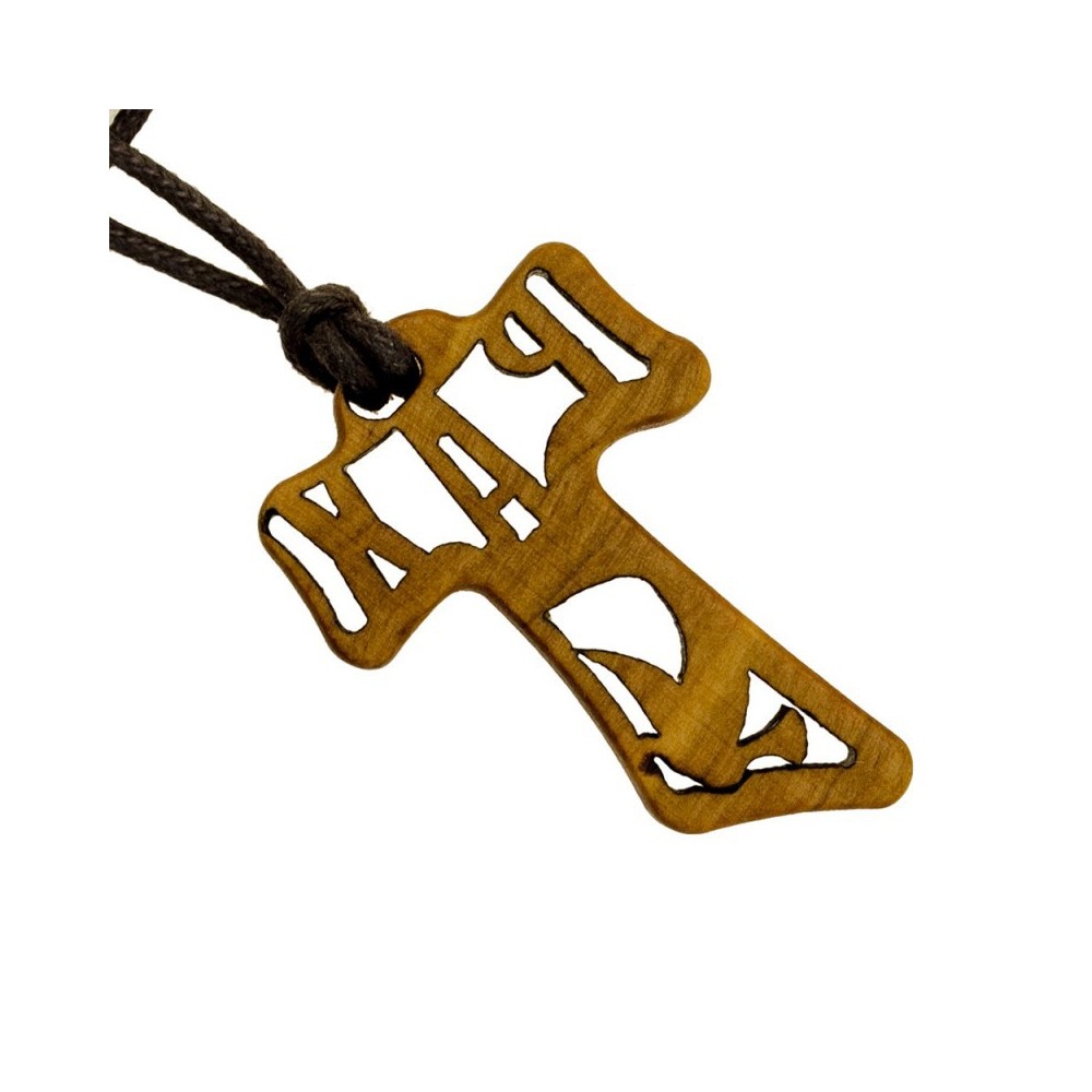Pierced cross made of olive wood with symbols of Confirmation. This pendant is 4 cm tall and 2.5 cm wide. Supplied with brown cord.
