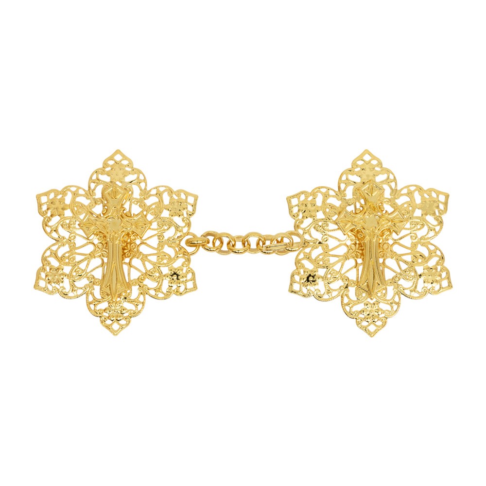 Liturgical cope clasp entirely made of metal with an elegant gold finish. The flower-shaped design with a raised cross makes this accessory especially suitable for sacred vestments.