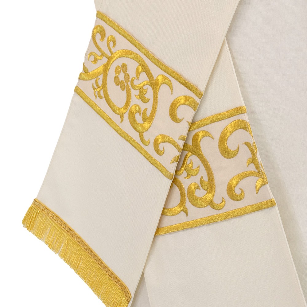 Priest cope of ivory color with rich embroidery and golden fringe.