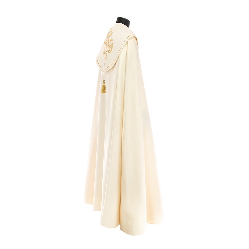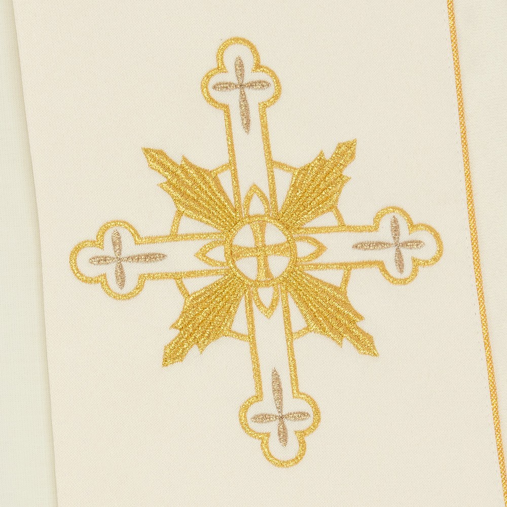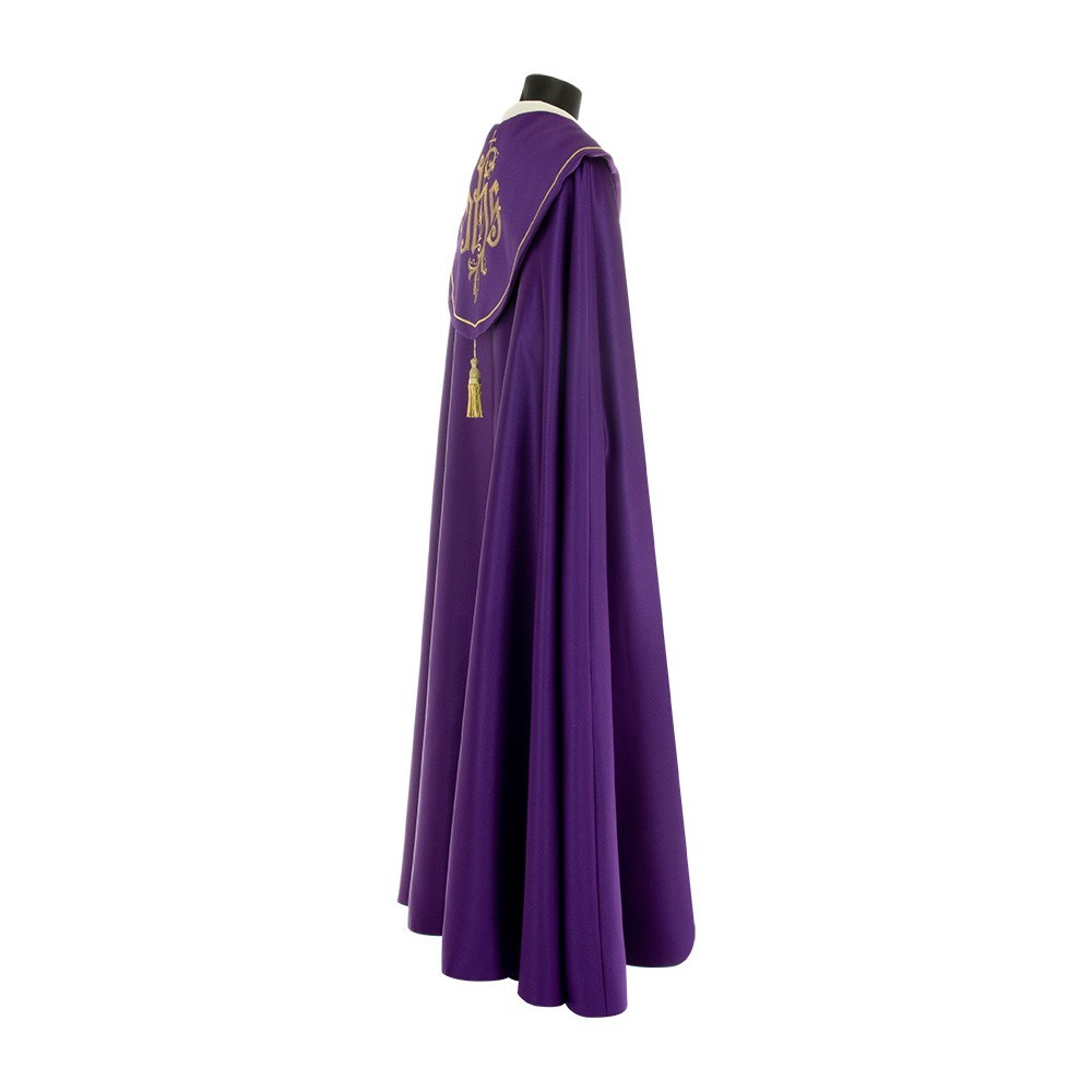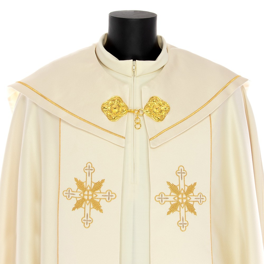 This vestment is made of pure polyester fabric, has a loose and round fit and is open on the front. It closes with a golden clasp at chest height. Provided with stole.