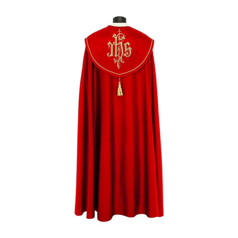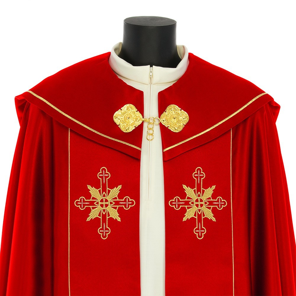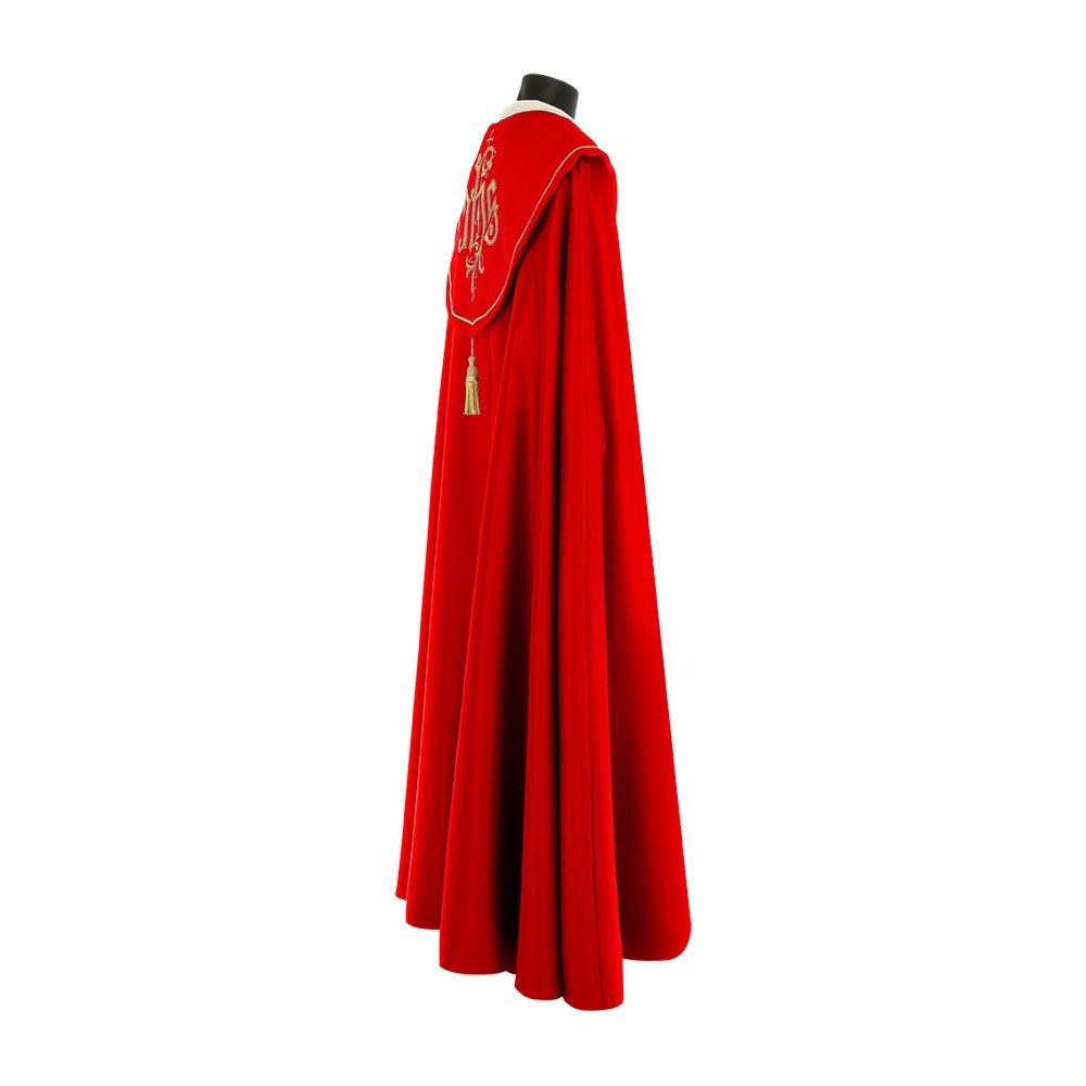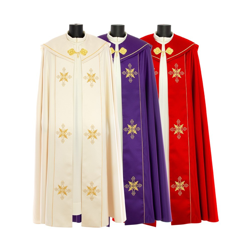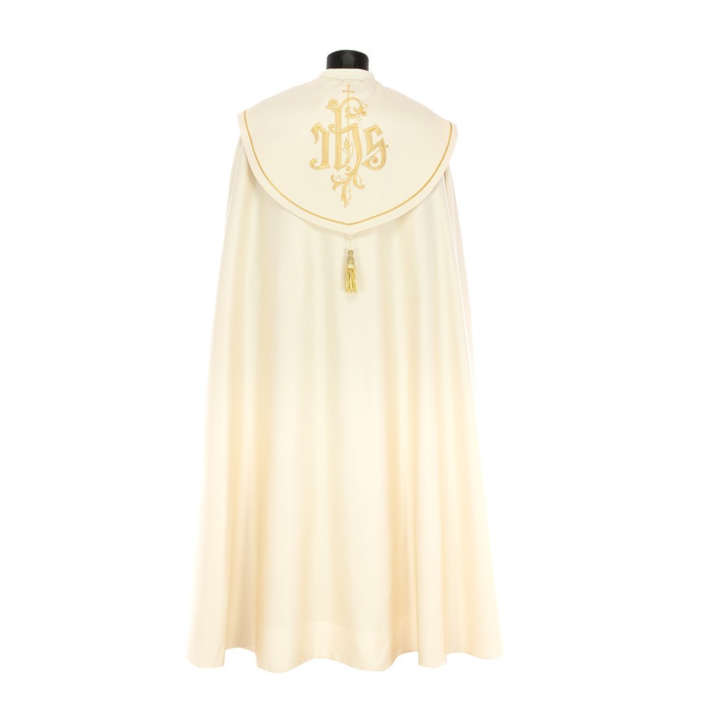 This vestment is made of pure polyester fabric, has a loose and round fit and is open on the front. It closes with a golden clasp at chest height. Provided with stole.