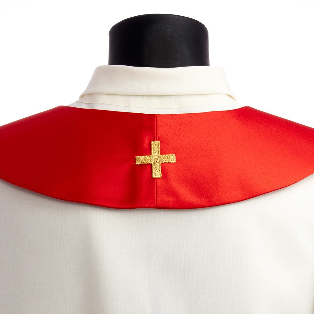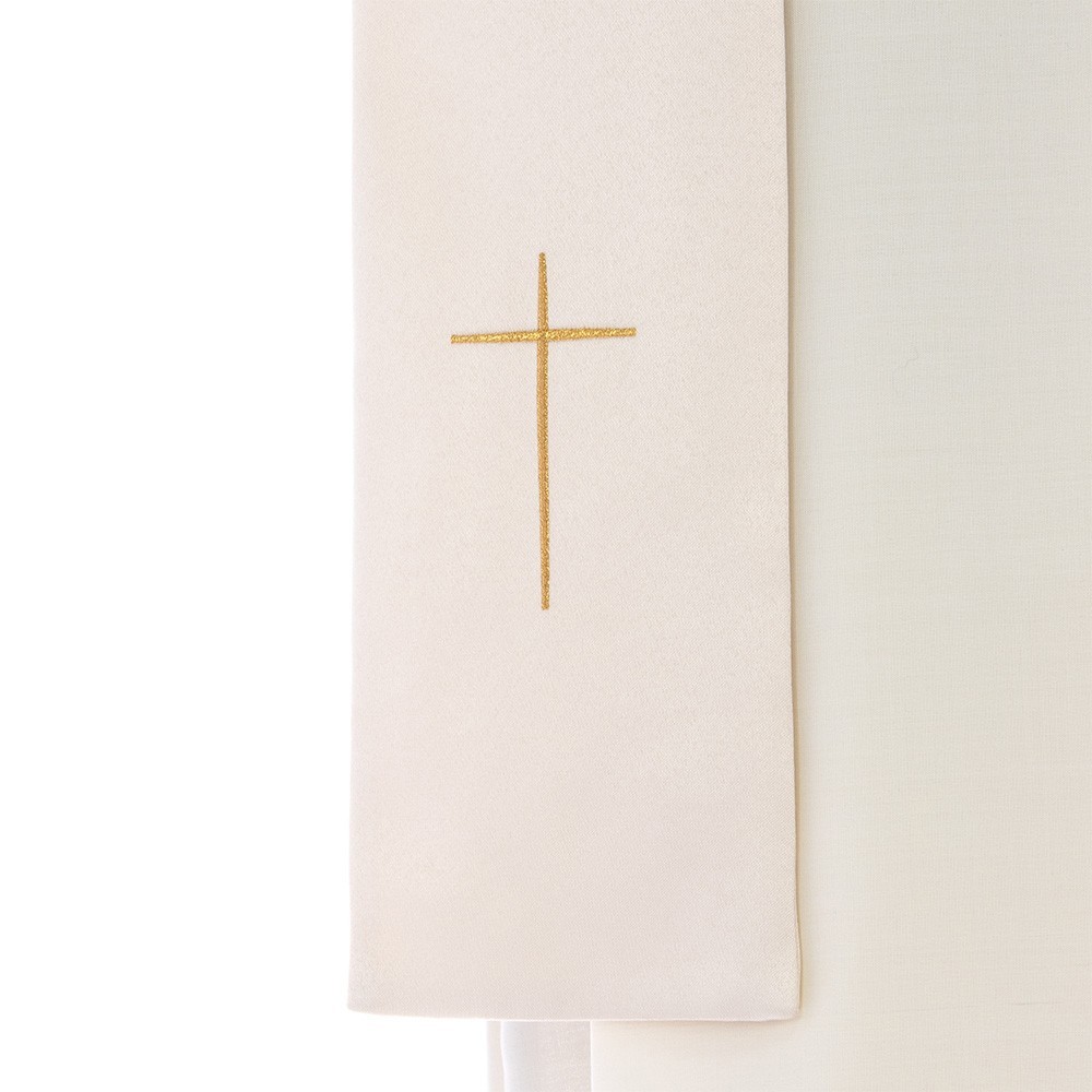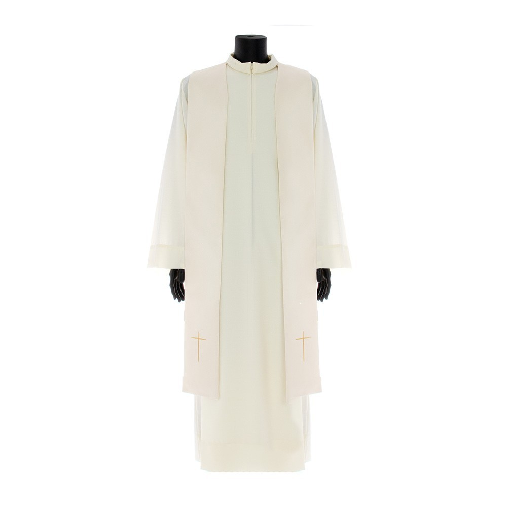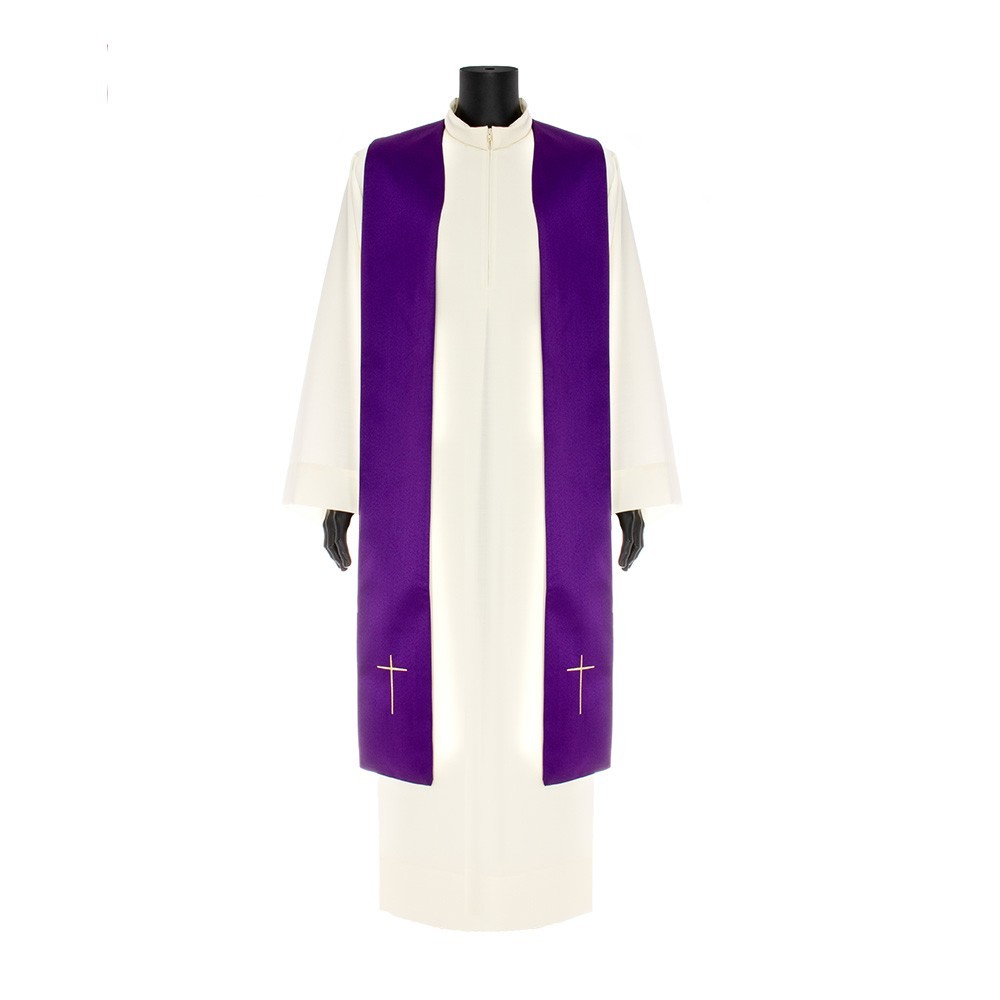 This vestment is made of pure polyester fabric, has a loose and round fit and is open on the front. It closes with a golden clasp at chest height. Provided with stole.