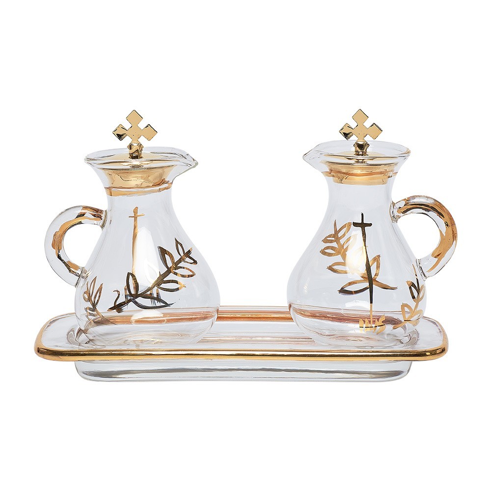 The set consists of two cruets of 100 cc which are finely decorated by hand and a glass rectangular tray. The cruets feature fine gold decorations.