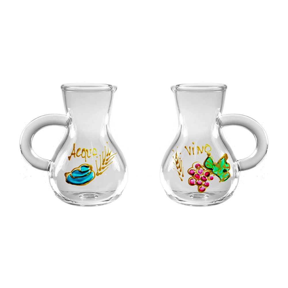 This liturgical set is composed of two decorated cruets for water and wine. They are made of glass and embellished with handpainted decorations. Maximum capacity: 75 ml.