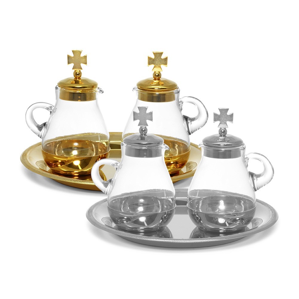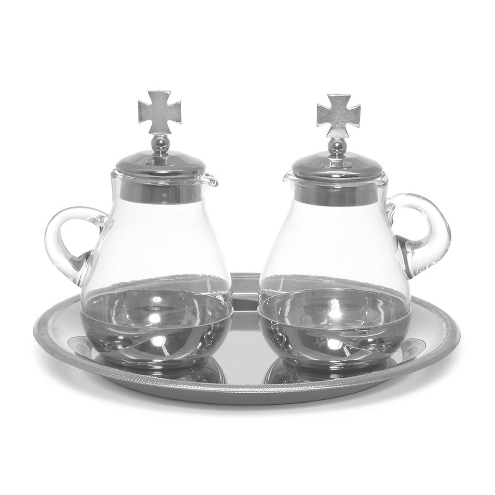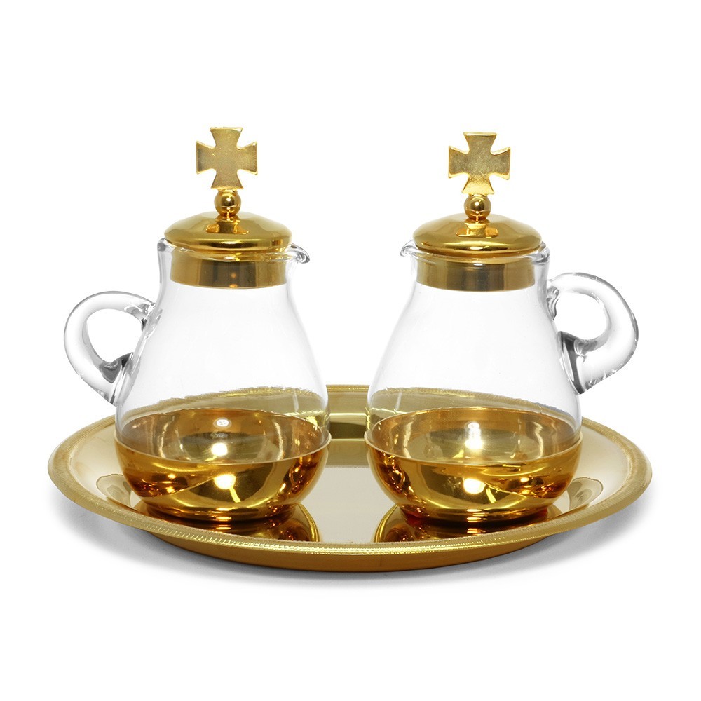 Cruet set for mass celebration complete with tray. These cruets (“Bologna” model) are made of glass and have a capacity of 110 ml. The tray and lids are made of brass. The tray is provided with cruets support to provide great stability.