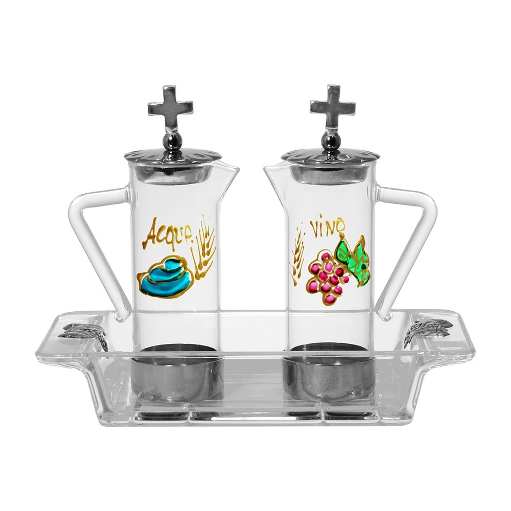 The cruets ("Ravenna" model) have a capacity of 65 ml and are entirely handpainted. Complete with glass tray decorated with silver grapes.
