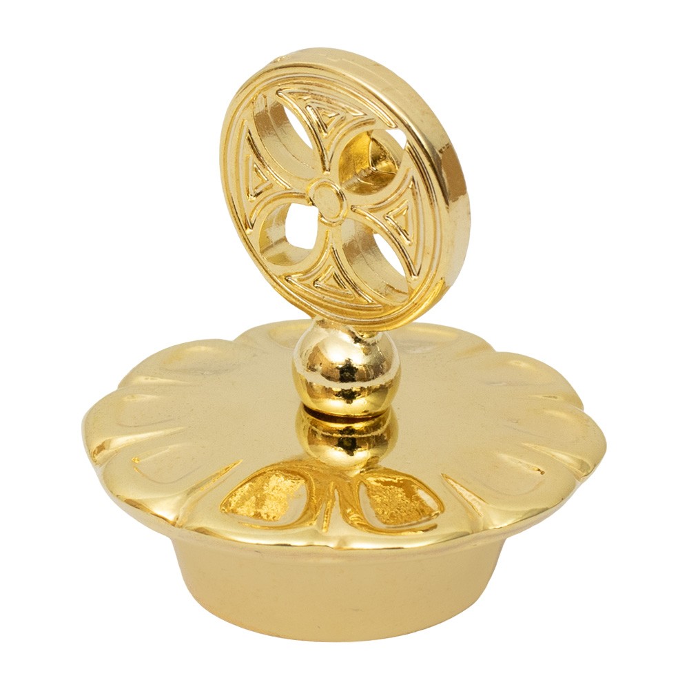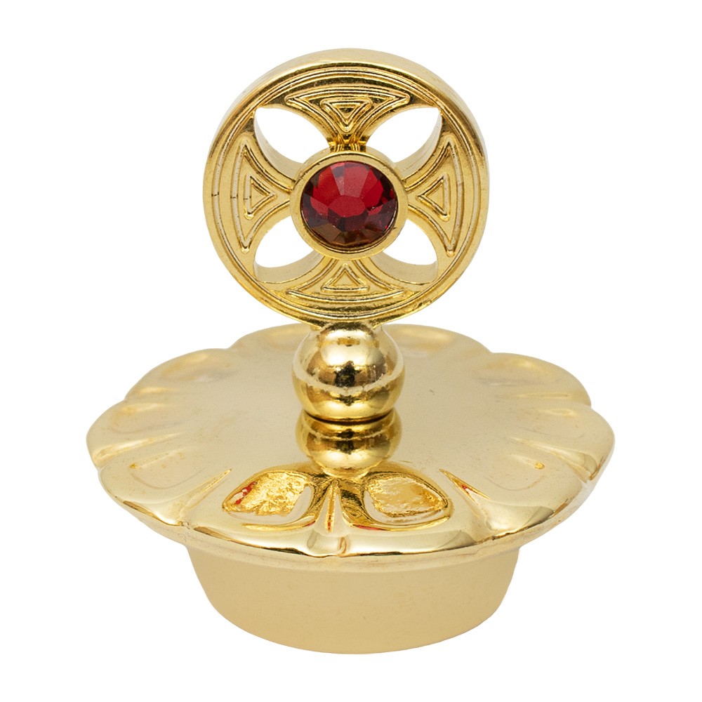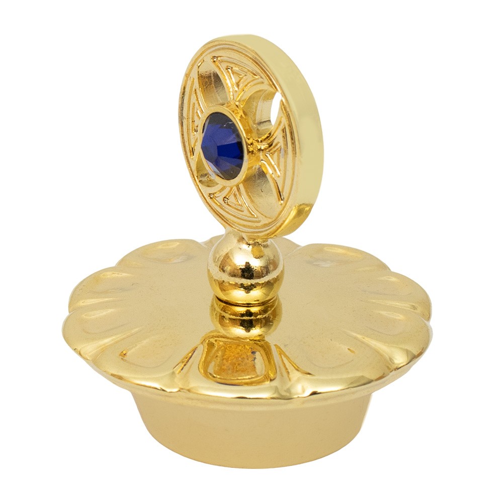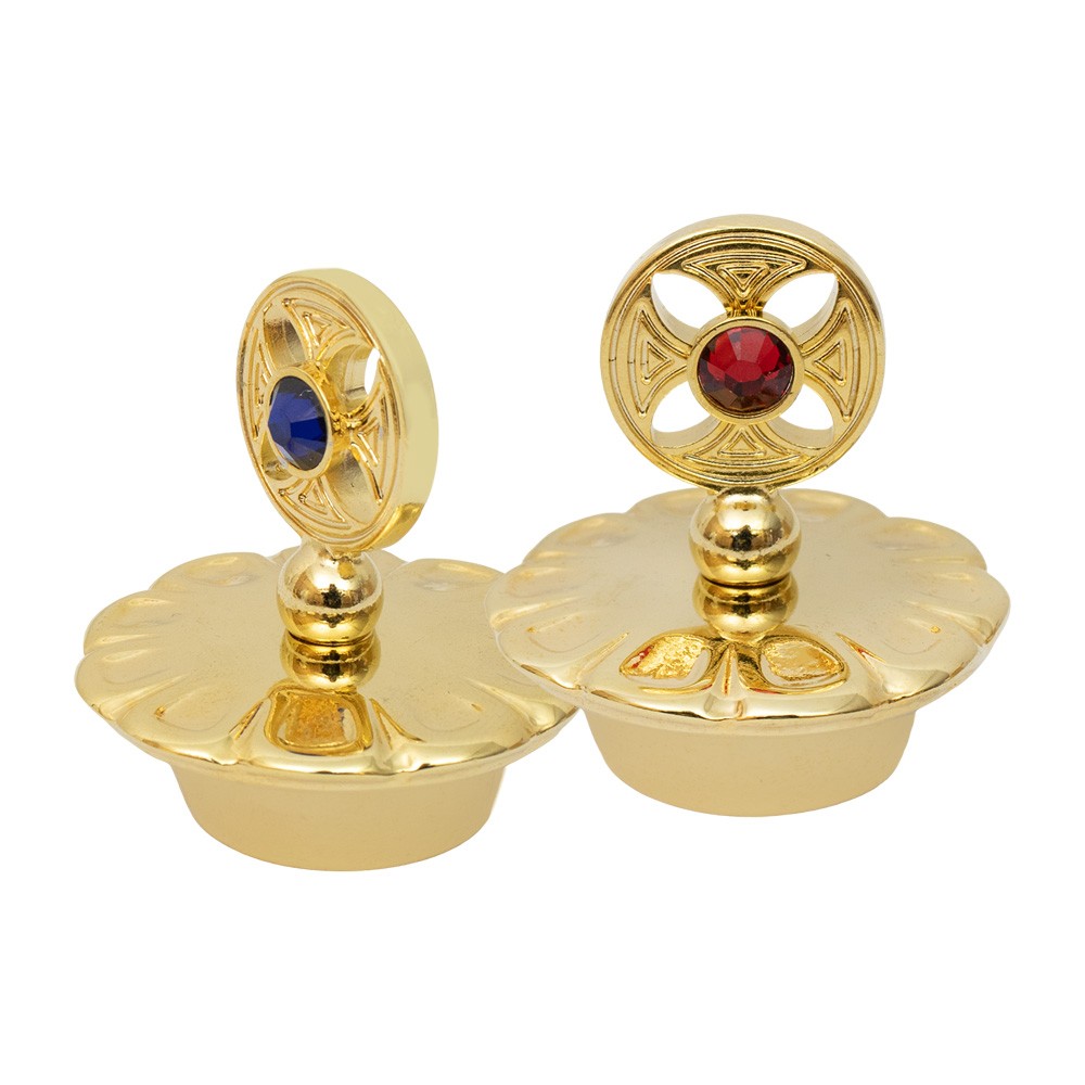 Replacement caps for water and wine cruets, made of metal with gilded and colored stones.