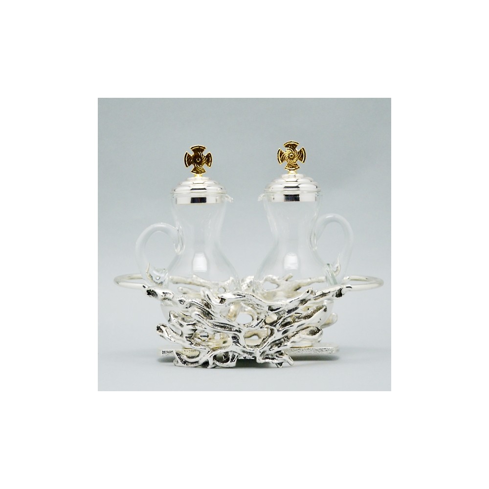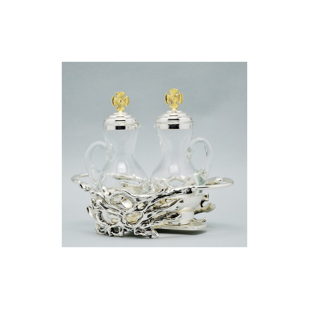 Glass cruets for altar with base made of silver-plated brass. The cruets are placed inside cups which help to keep them still on the tray.