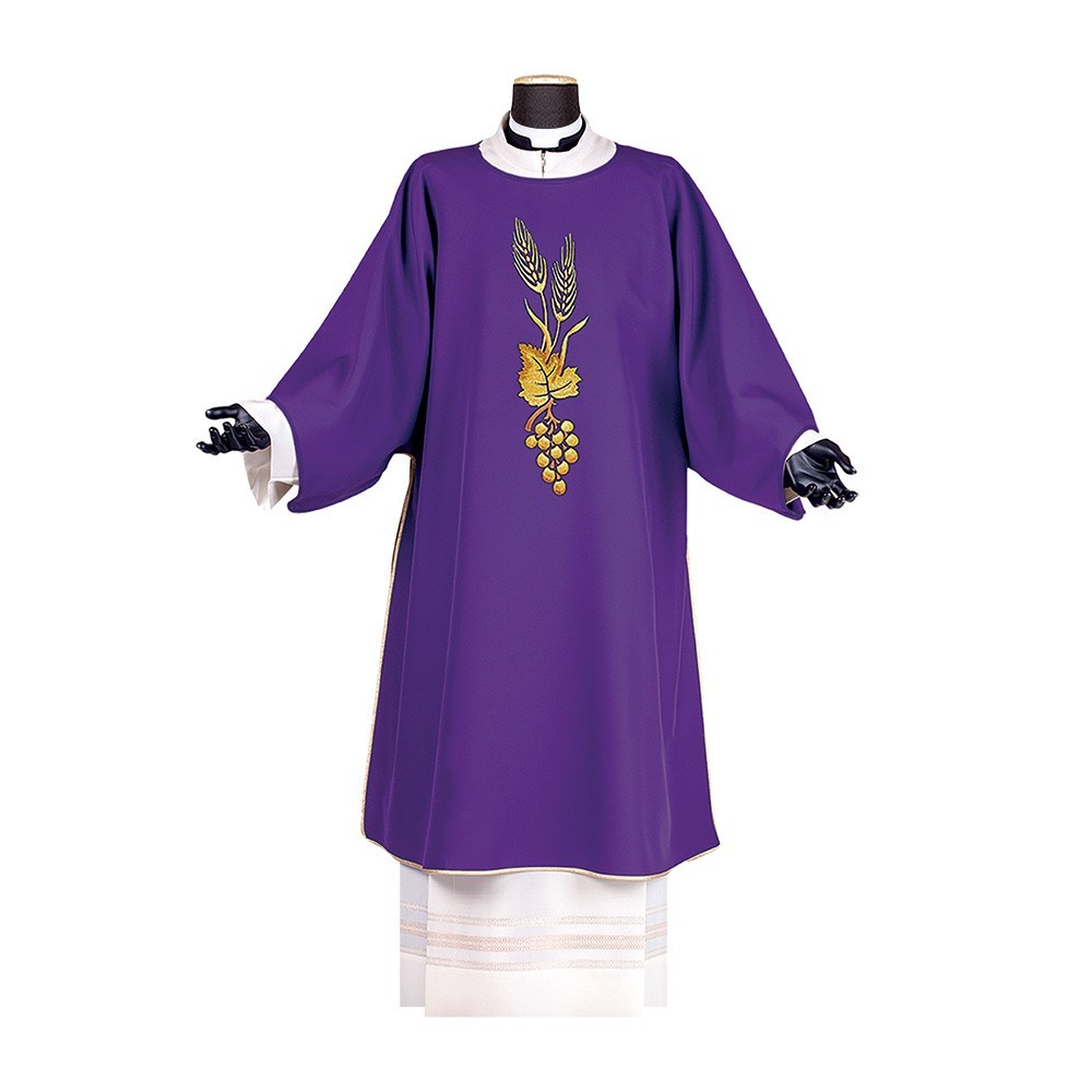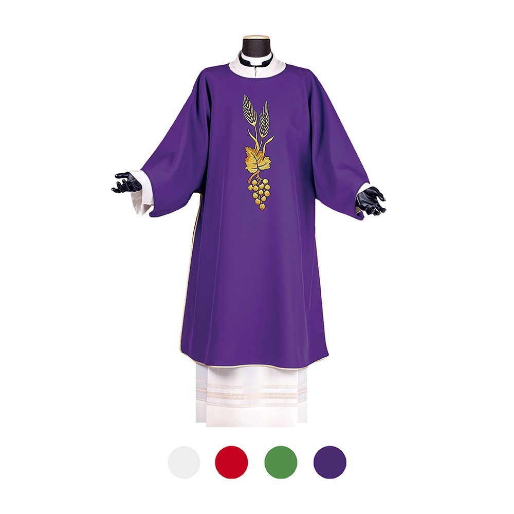 Dalmatic available in four liturgical colors. This dalmatic is made of light and fresh polyester fabric. The embroideries are applied on the front and back of the dalmatic and are made using top quality looms.