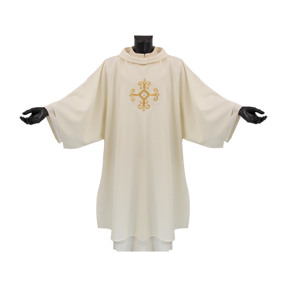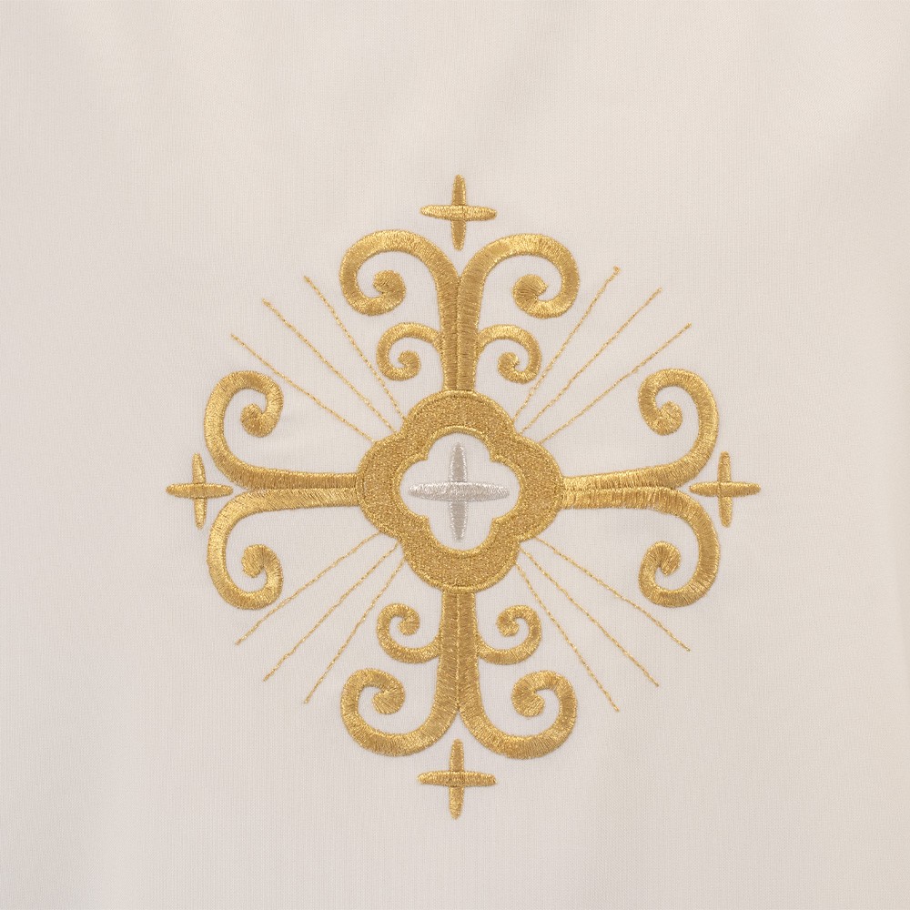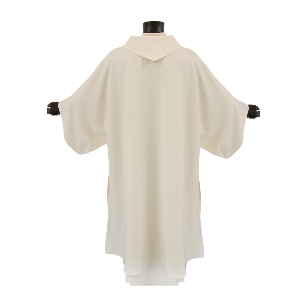 This dalmatic features an embroidered cross on the front. The embroidery is entirely made by machine with top quality looms.