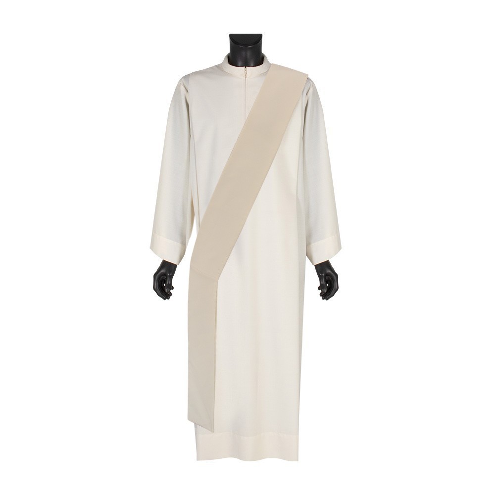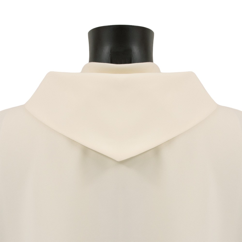 Ivory-colored dalmatic with round collar, made of light and durable fabric in pure polyester.