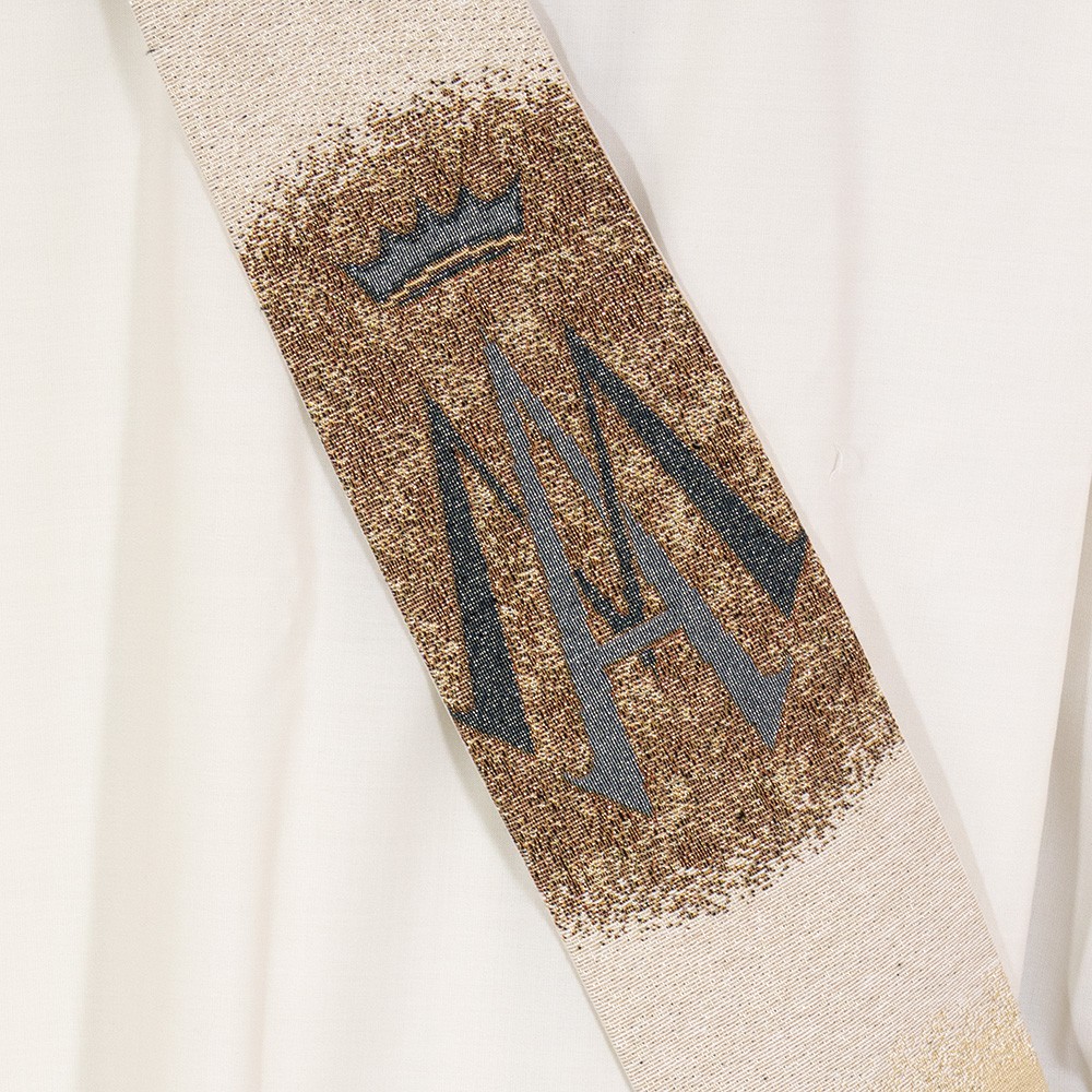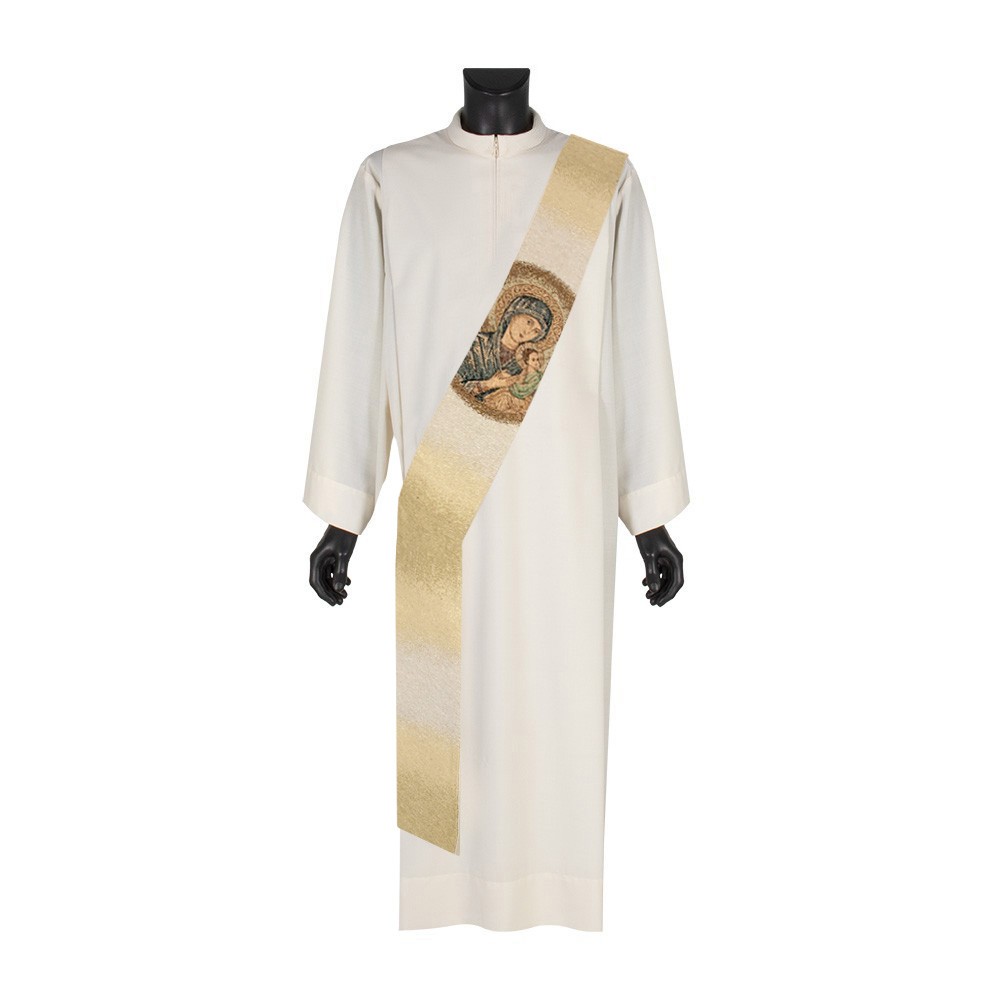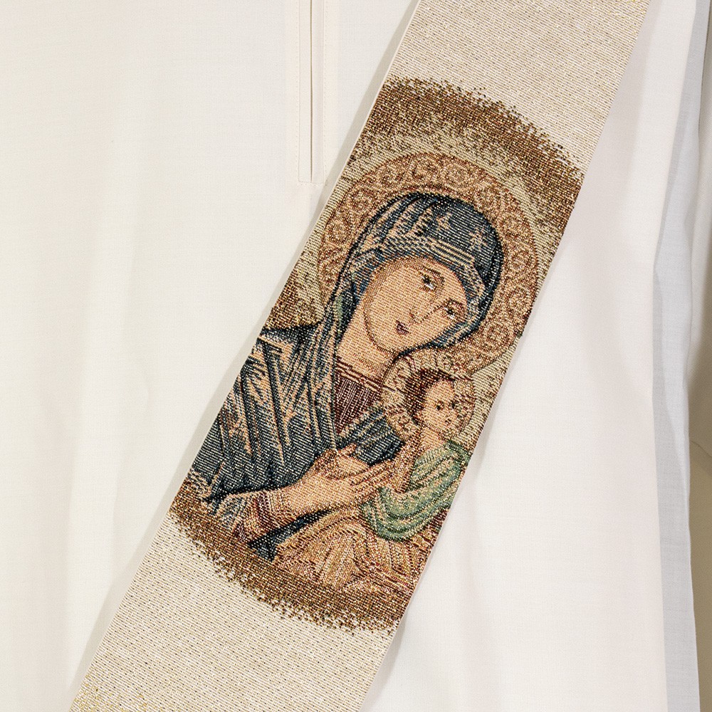 Ivory diaconal stole with embroidery dedicated to Our Lady of Perpetual Help.