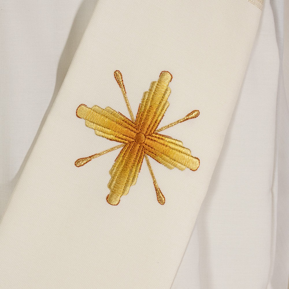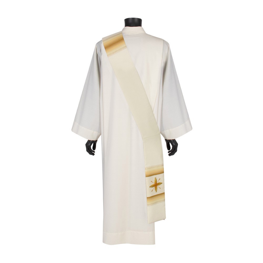 Elegant deacon stole made of wool and silk. It features golden and colored stripes.