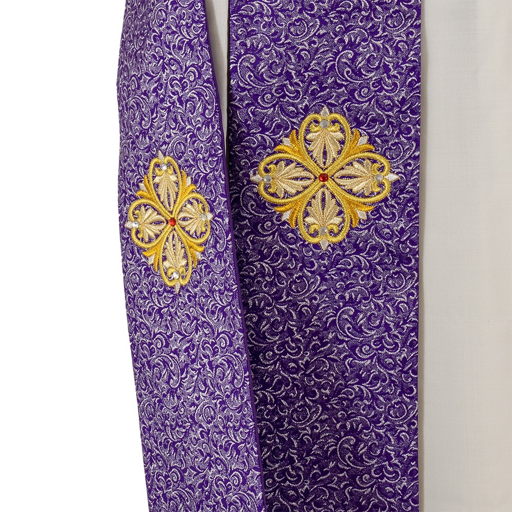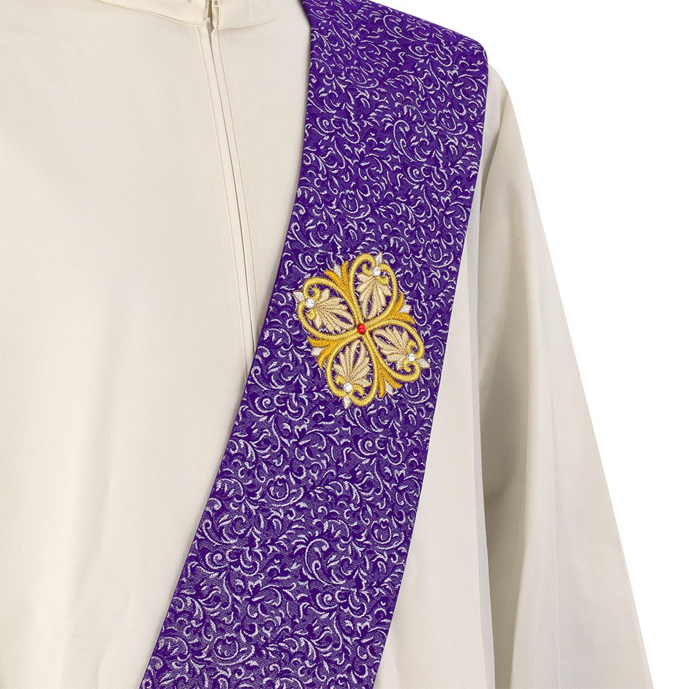 This stole features an embroidered cross surrounded by 4 clear stones and one red stone. This decoration is present on both sides.