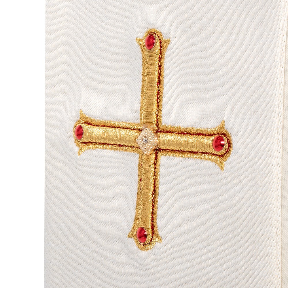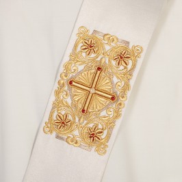 Diaconal stole with rich golden embroidery, enriched by colored stones. Made in Poland. Made of polyester fabric. The embroidery is made by machine with great care and precision using yarn of golden color. The stole is made by a Polish company using the finest materials and manufacturing techniques.