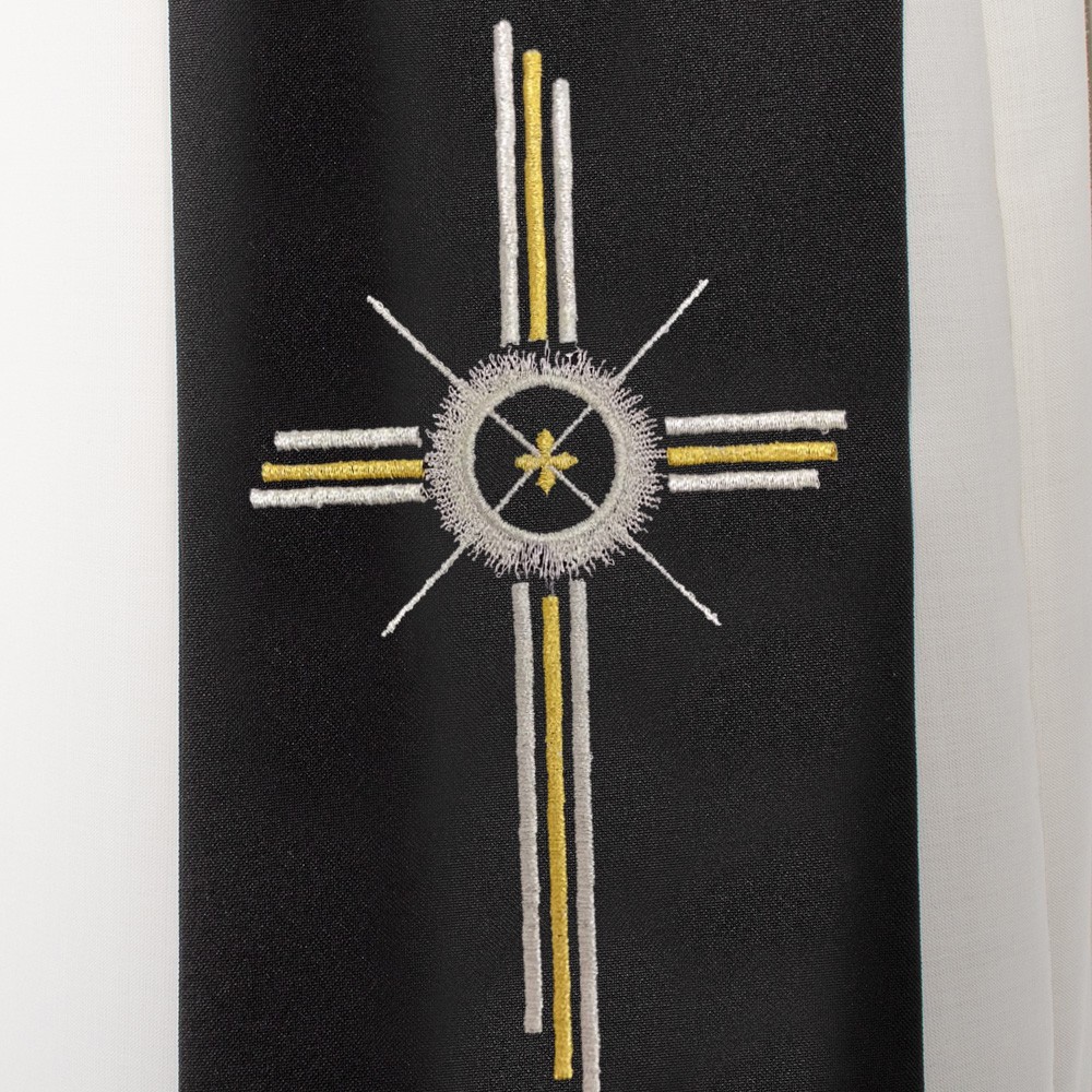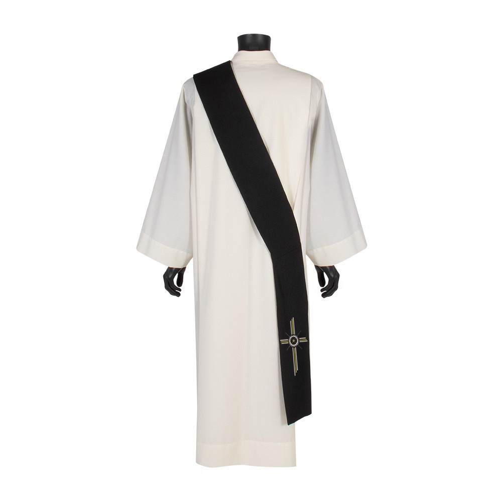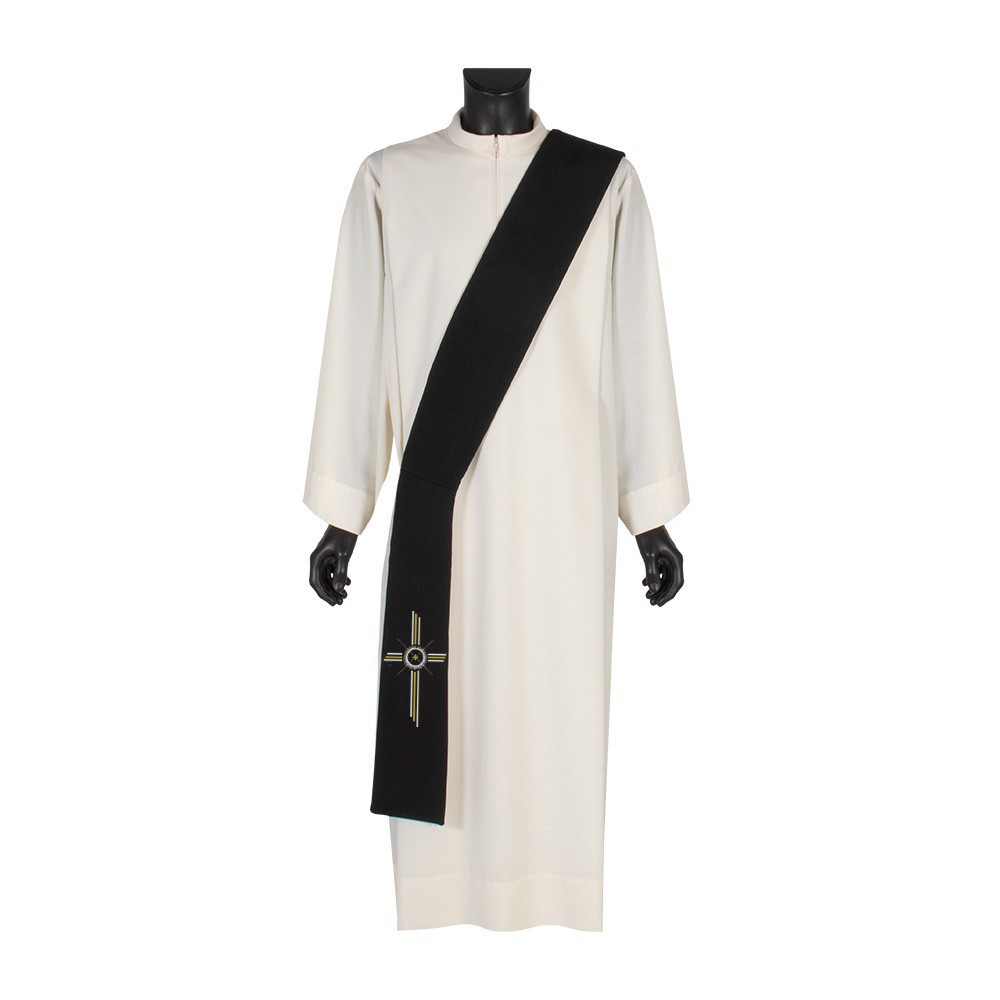 Black deacon stole made of polyester fabric. This elegant stole features a double-sided stylized cross. Product of excellent quality entirely crafted in Italy.