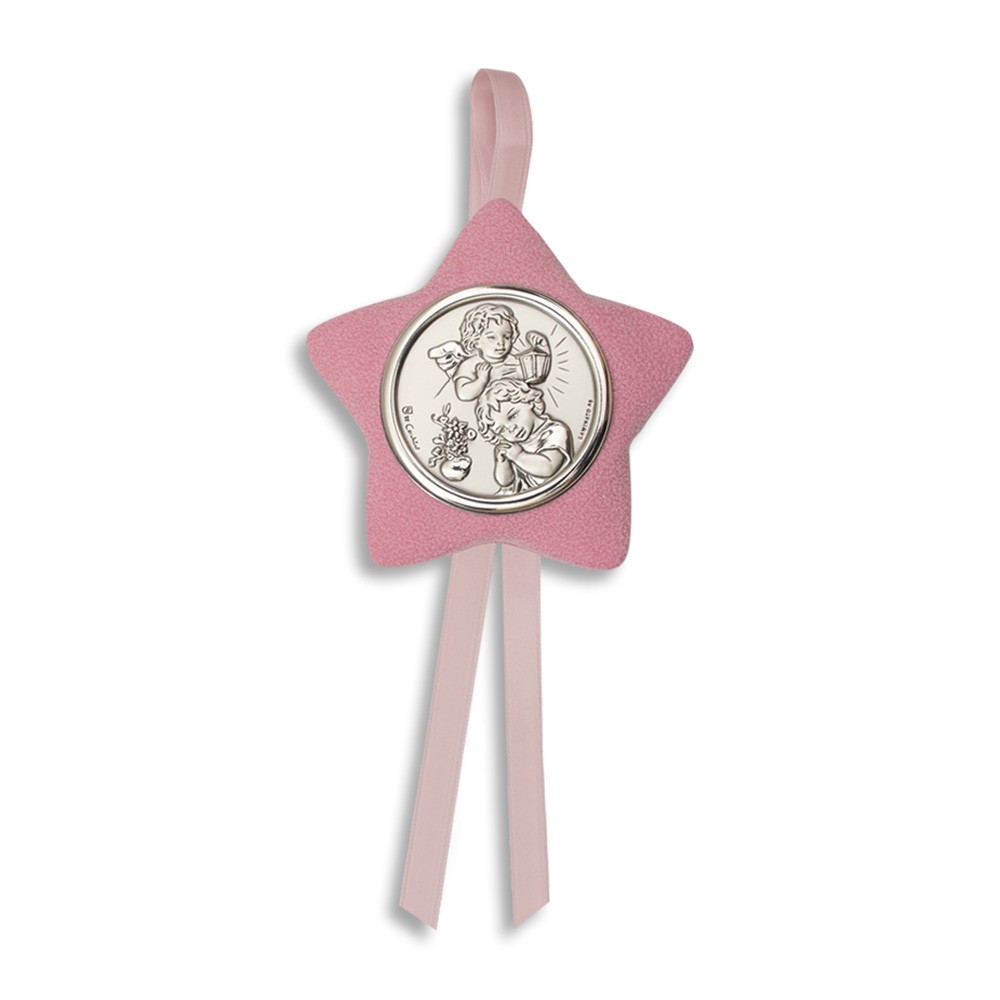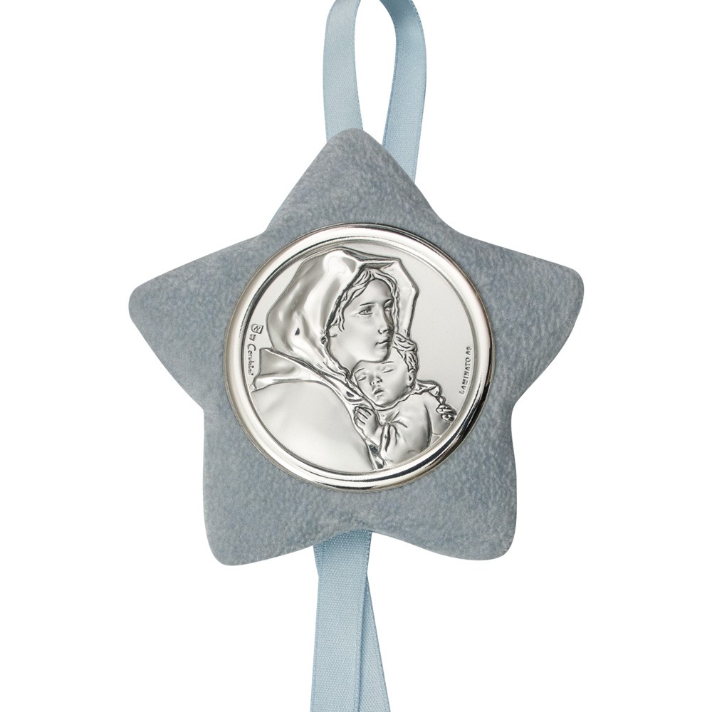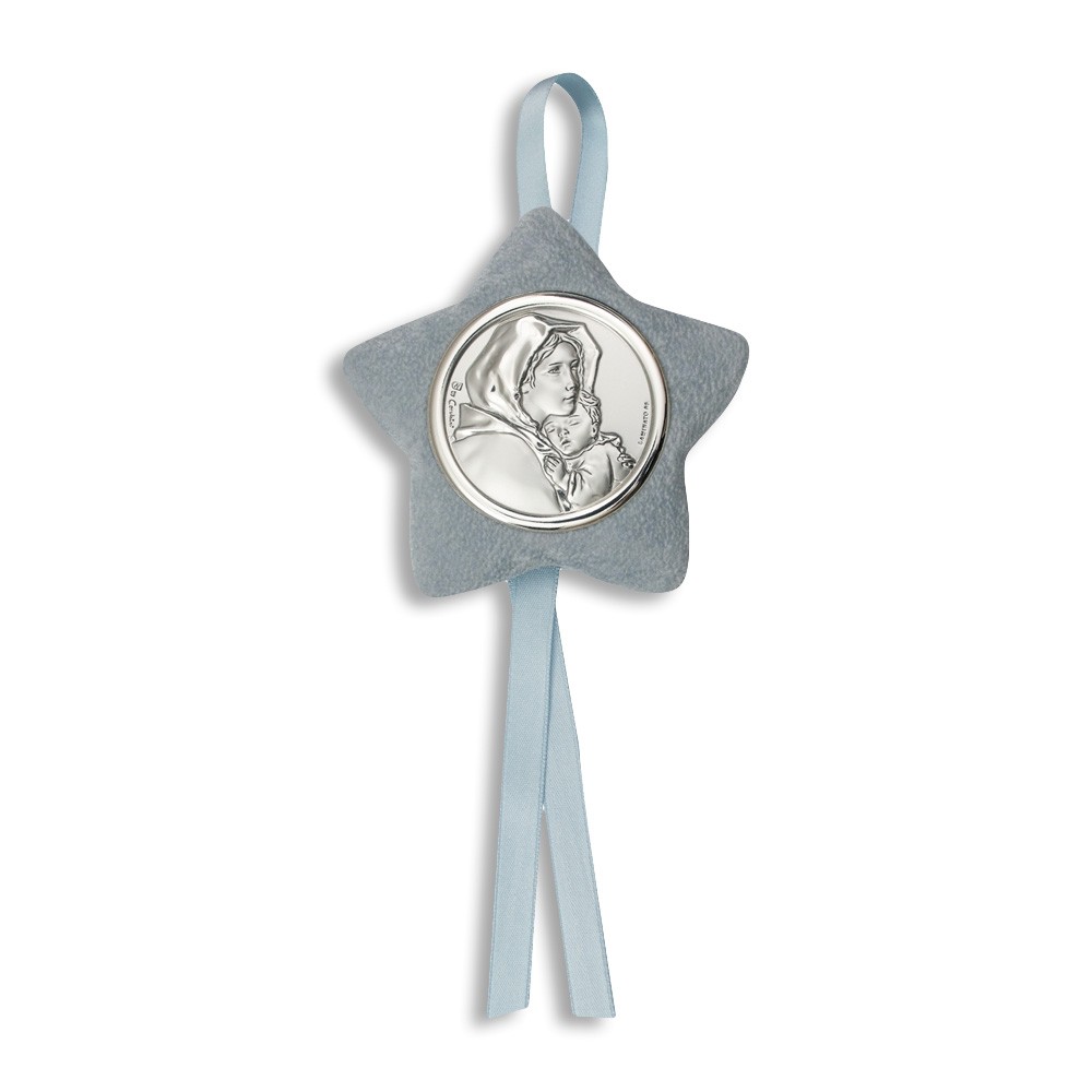 Star-shaped cradle decoration with ribbon and plaque in bilaminated silver.