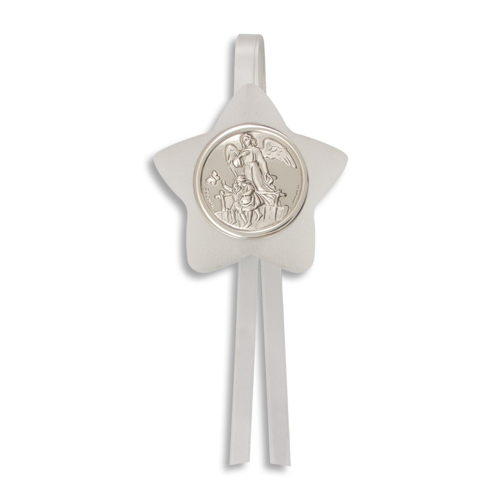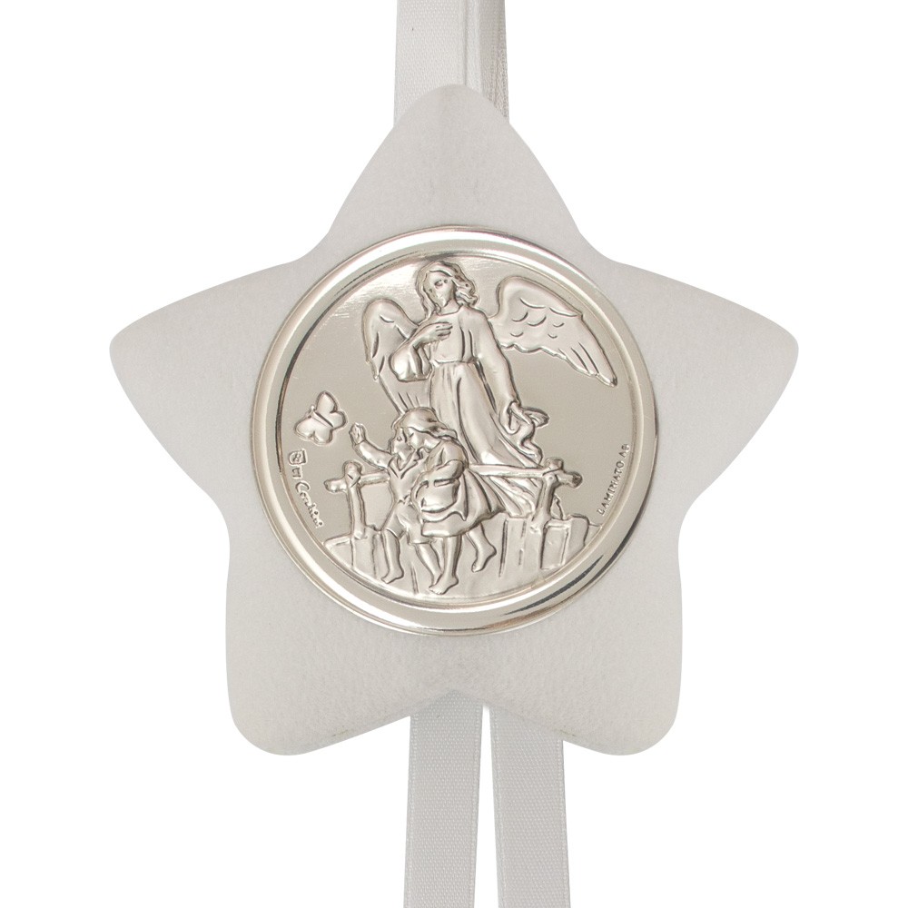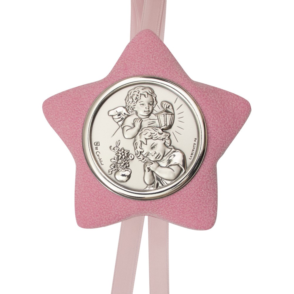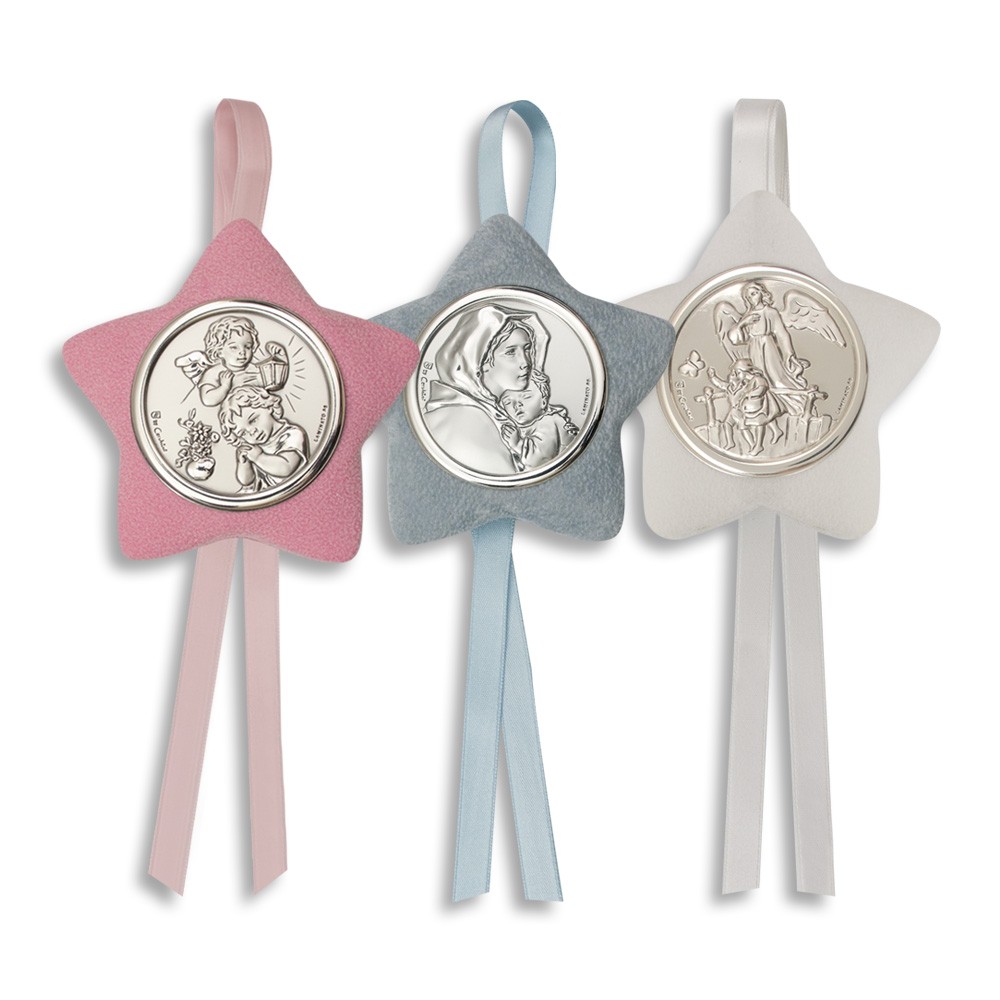 Star-shaped cradle decoration with ribbon and plaque in bilaminated silver.